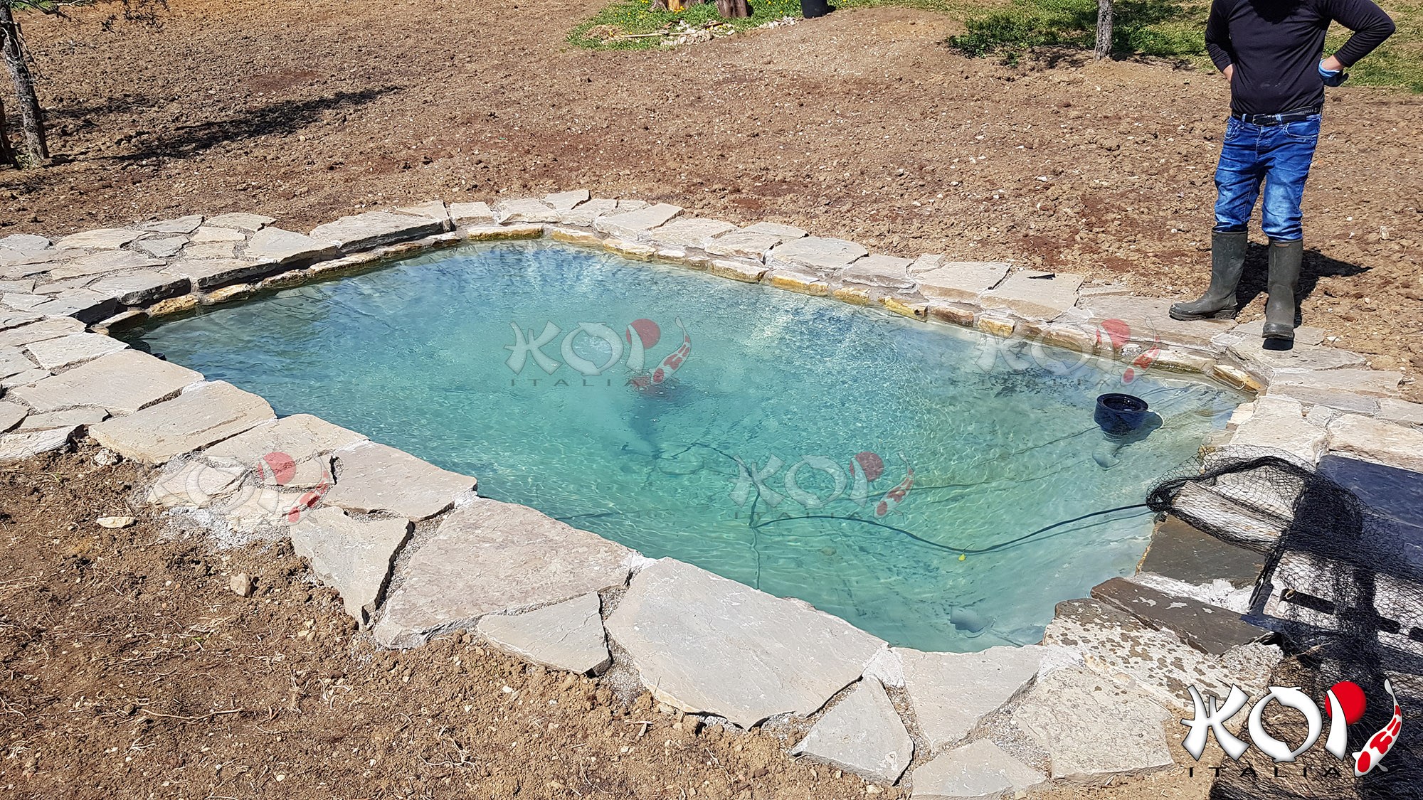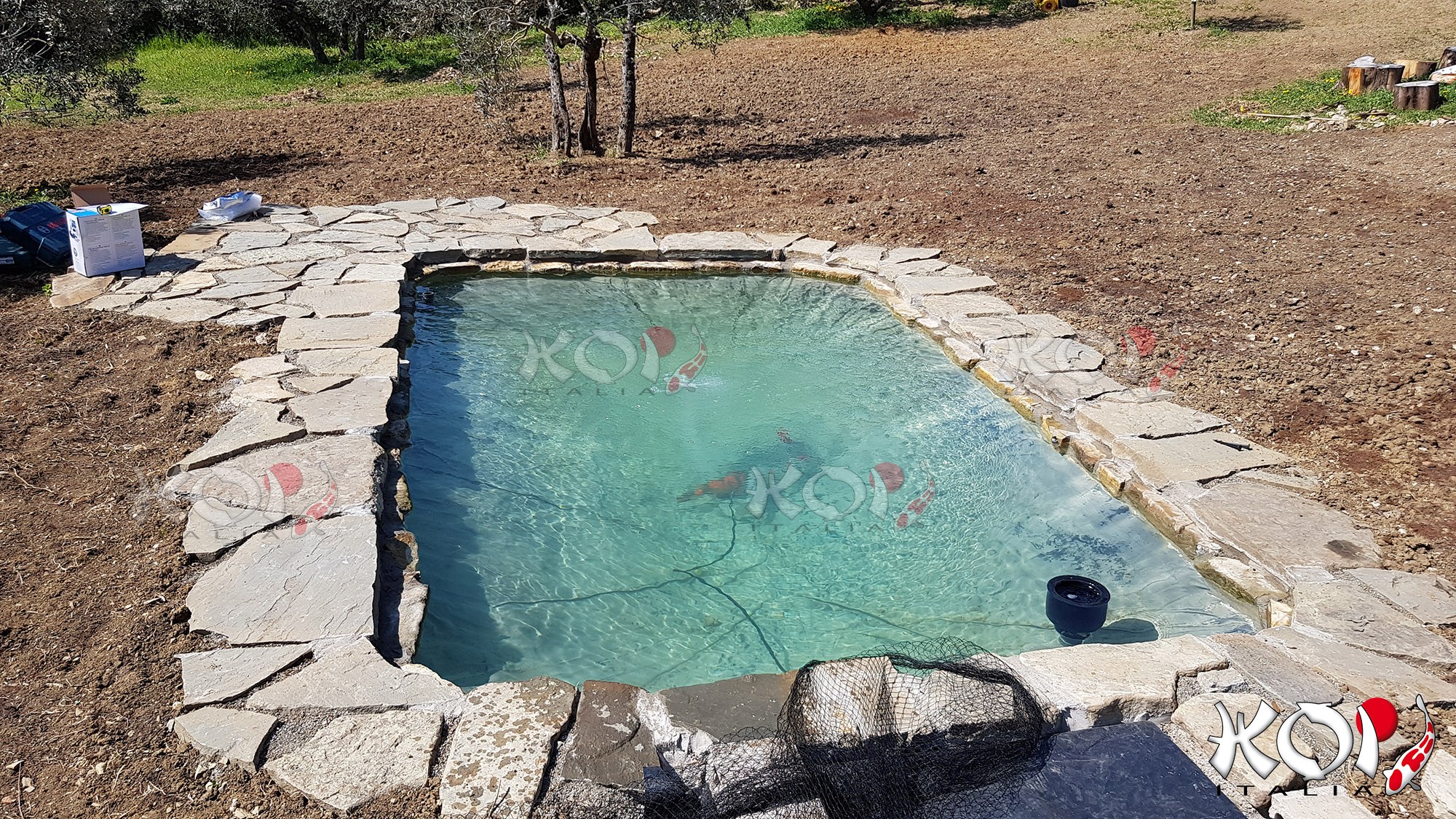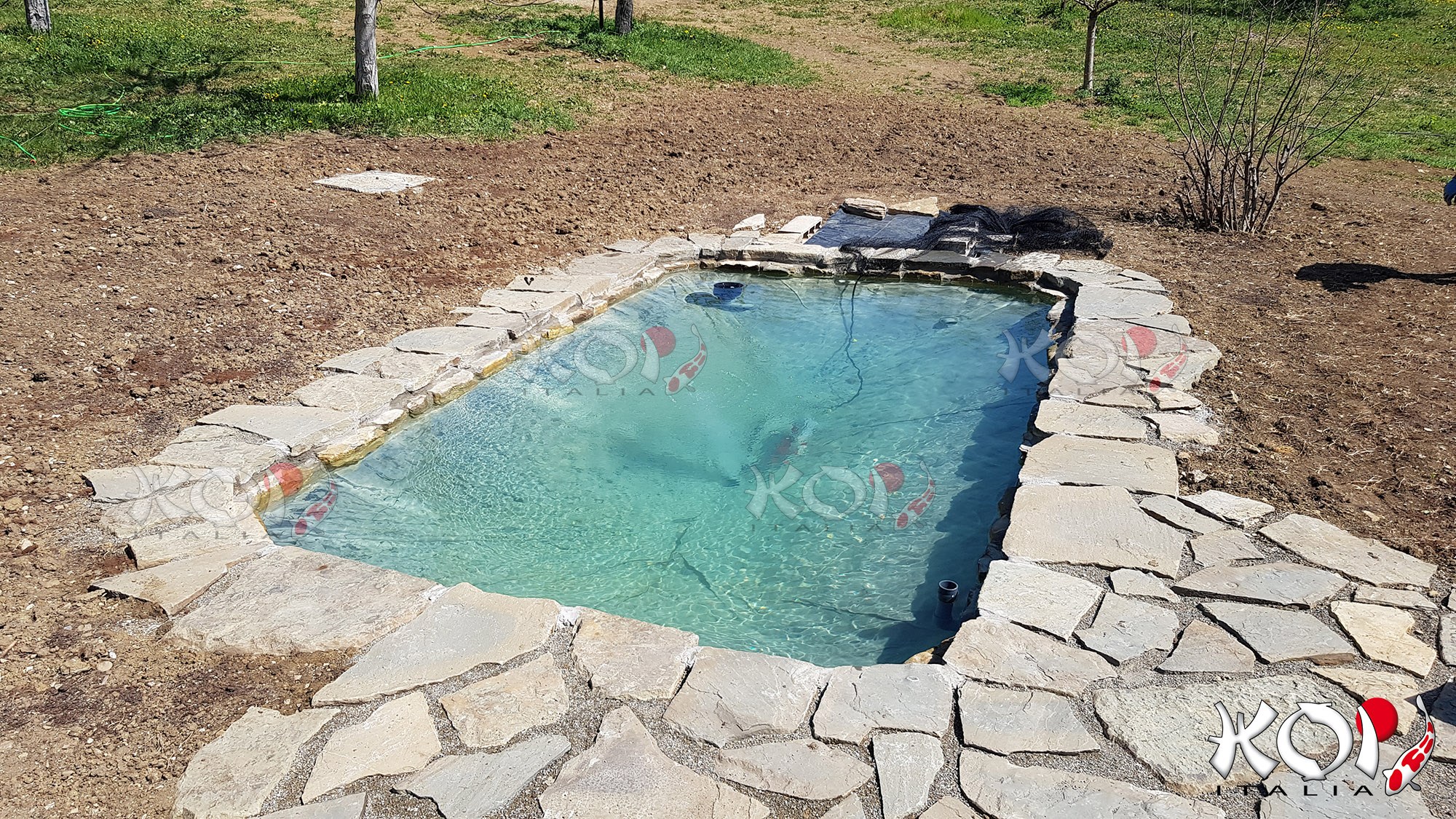 Koi pond realizzato in Toscana con telo in EPDM e filtro a pressione.