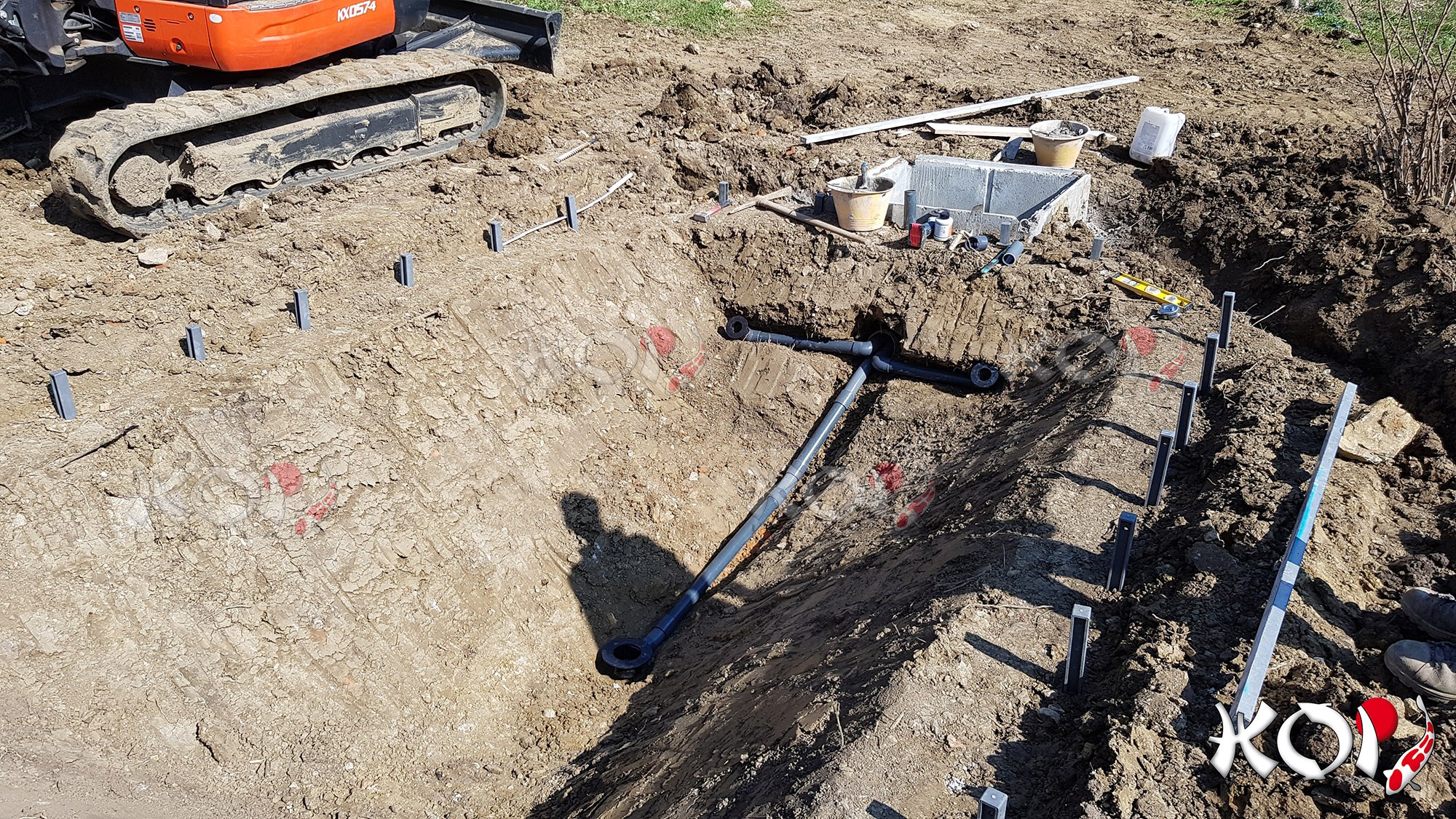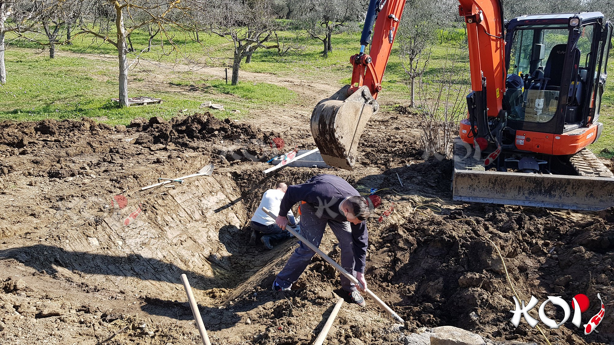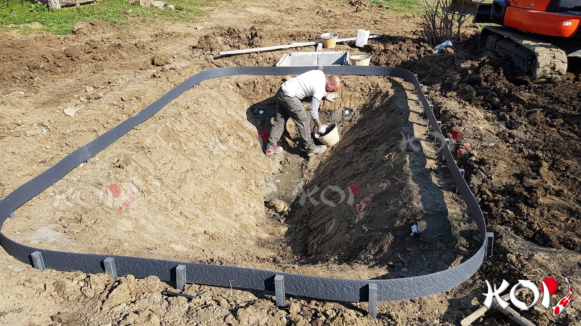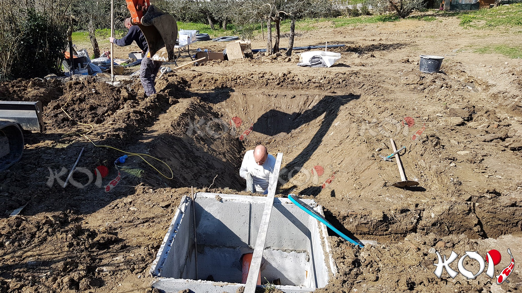 Koi pond realizzato in Toscana con telo in EPDM e filtro a pressione.
