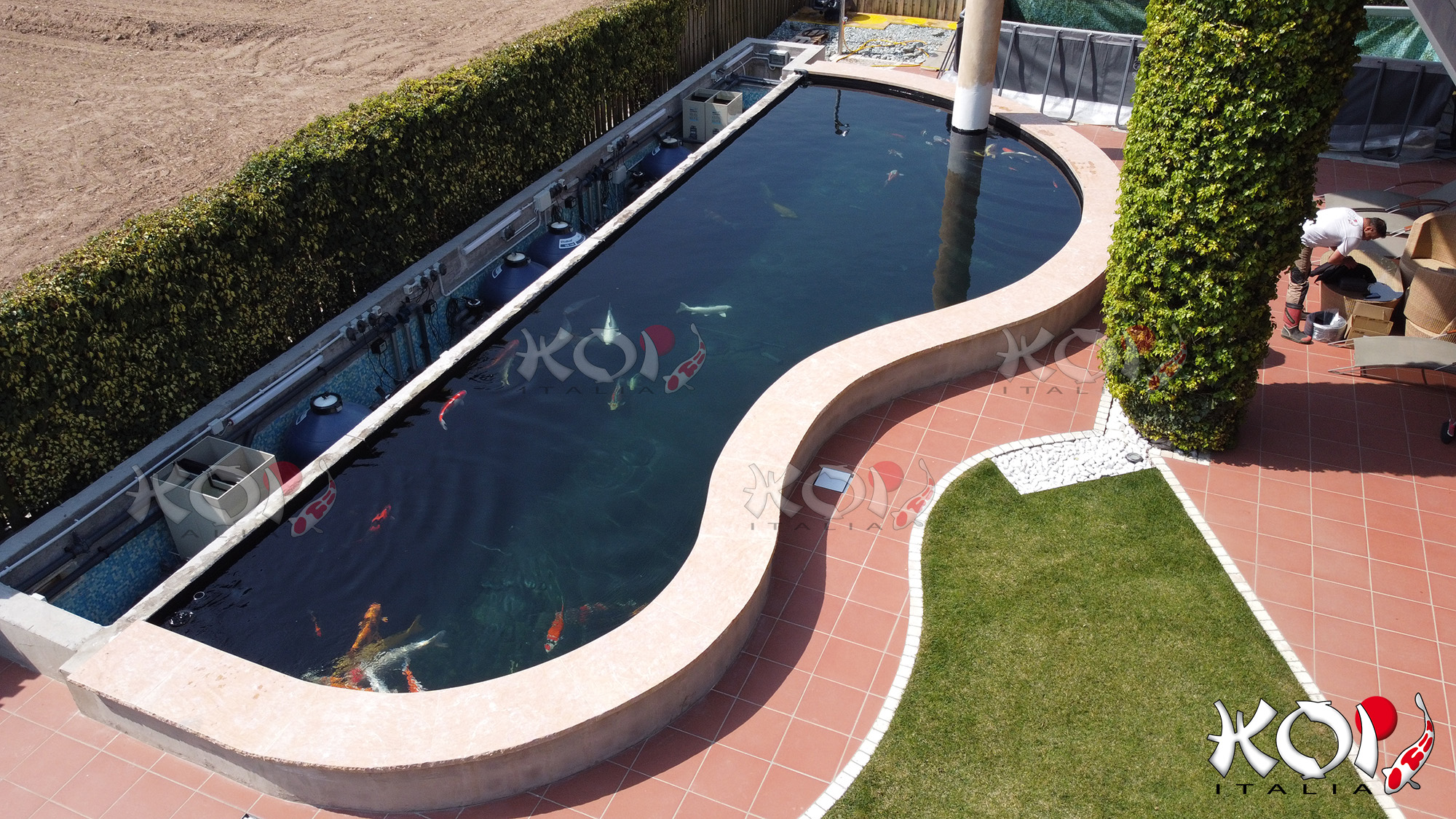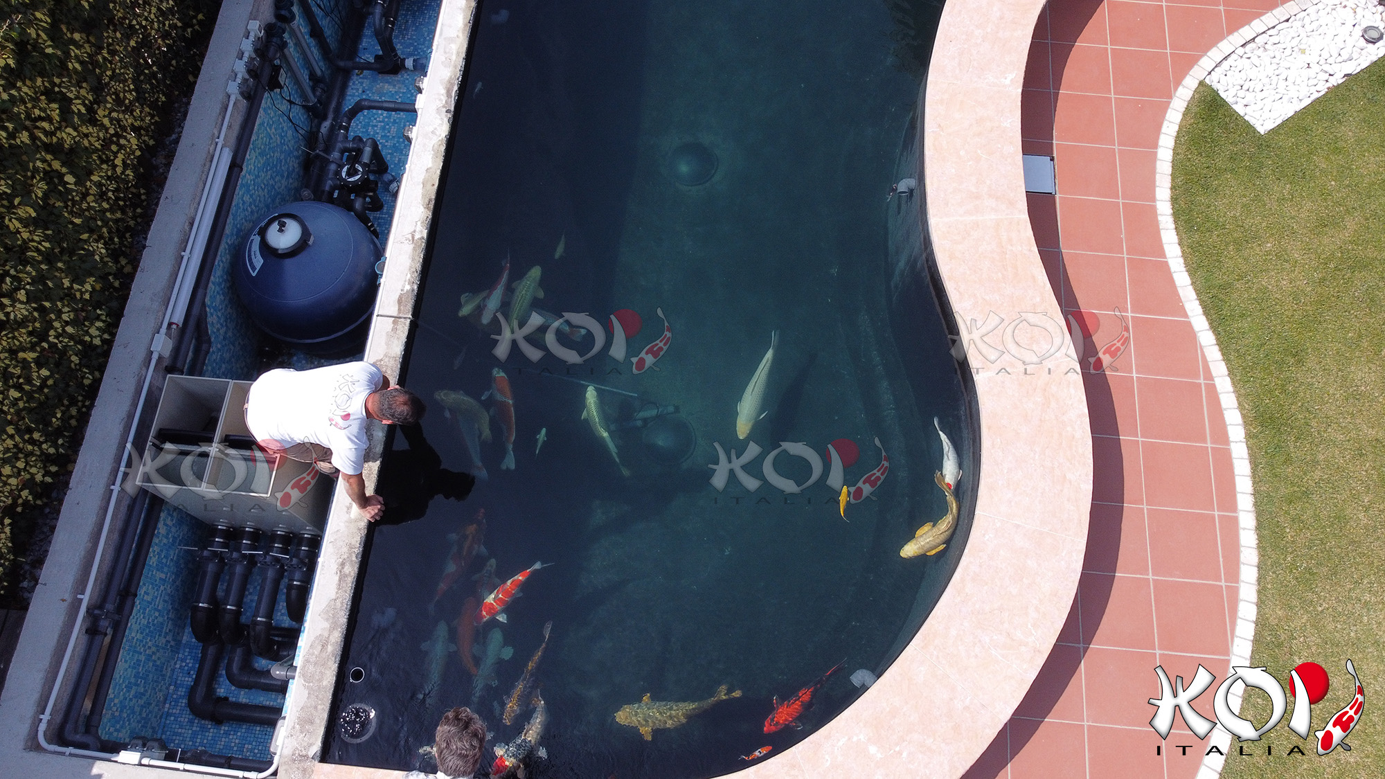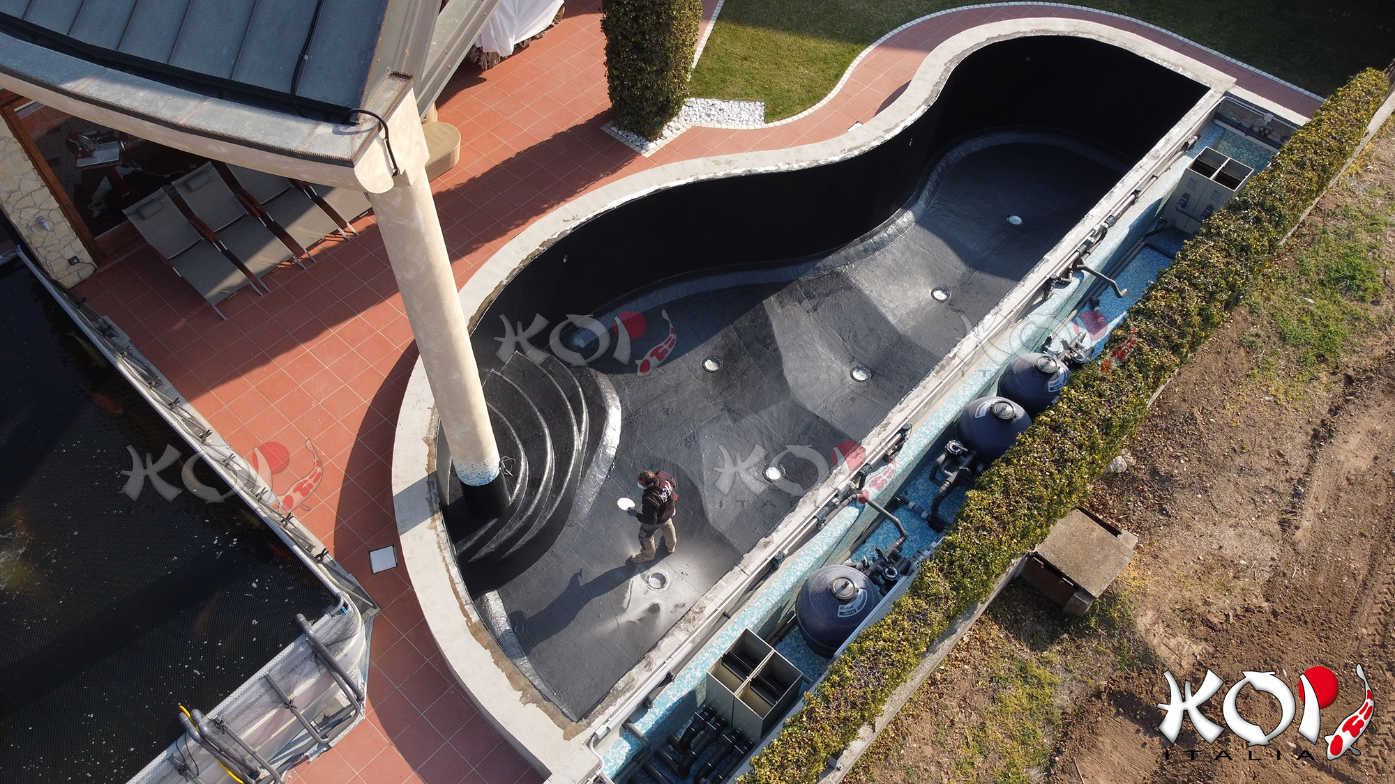 Trasformazione di una piscina in cemento armato, in un koi pond da 150.000 litri. La passione per le koi di questo koi keeper era così grande da decidere di trasformare la propria piscina in un koi pond. Una delle tante difficoltà di questo progetto è stato l'inseriemnto del sistema di filtraggio nel locale precedentemente destinato alla tapparella che copriva la piscina durante l'inverno. Impermeabilizzazione in vetroresina e sistema di filtraggio con quattro linee in parallelo composte da Sieve e Fltri a perline. A breve le foto del lavoro terminato con la copertura del locale tecnico.