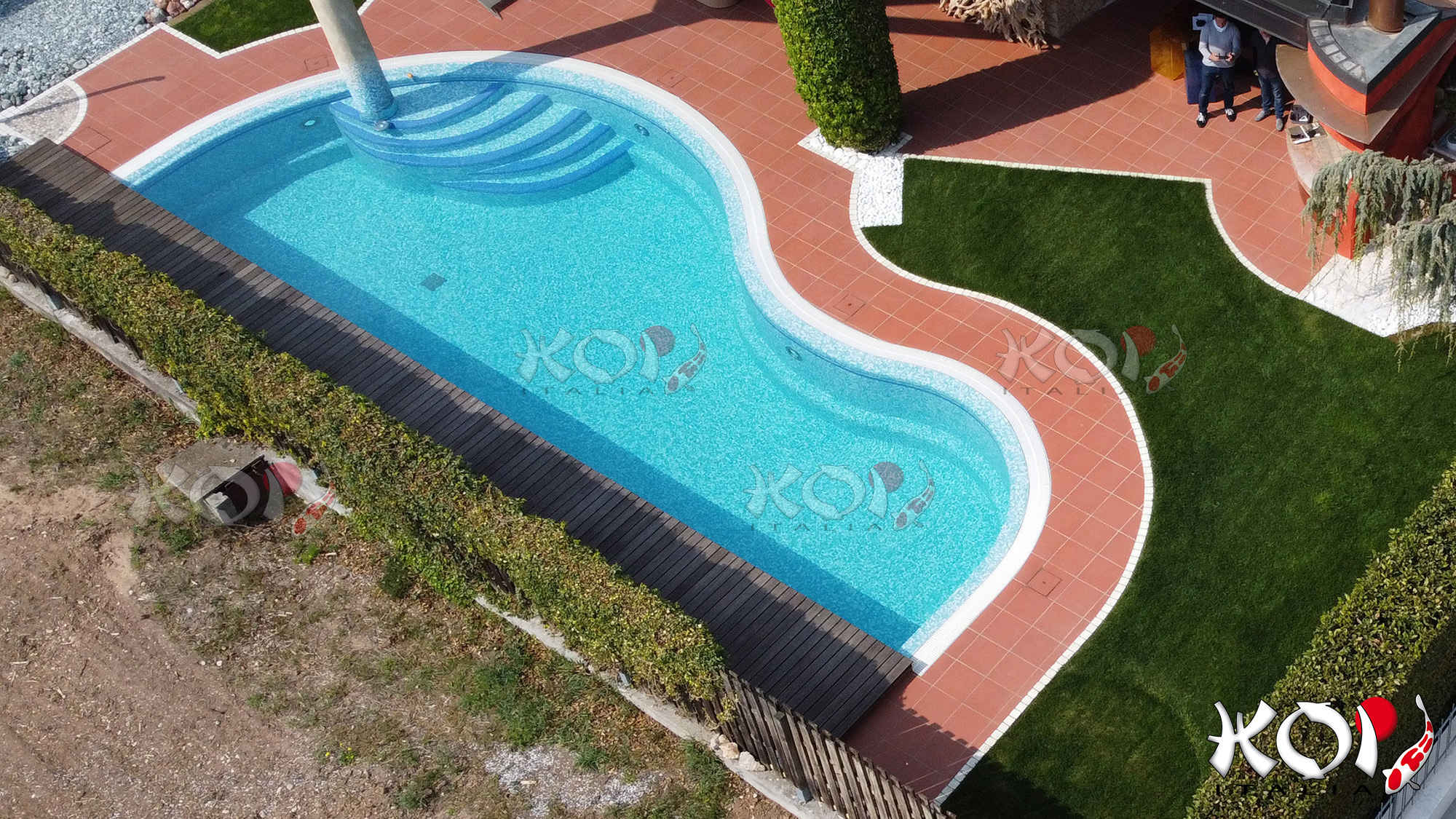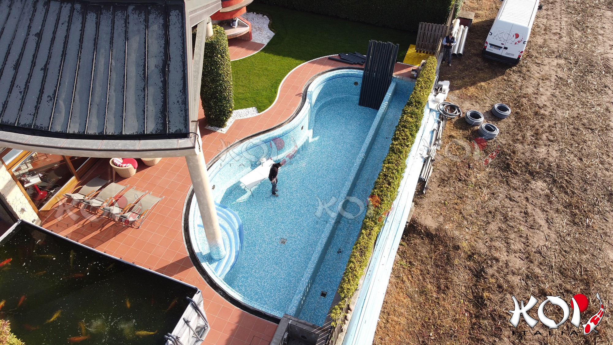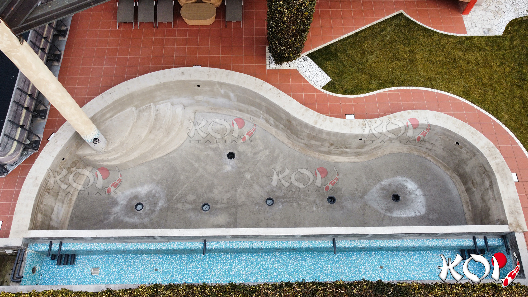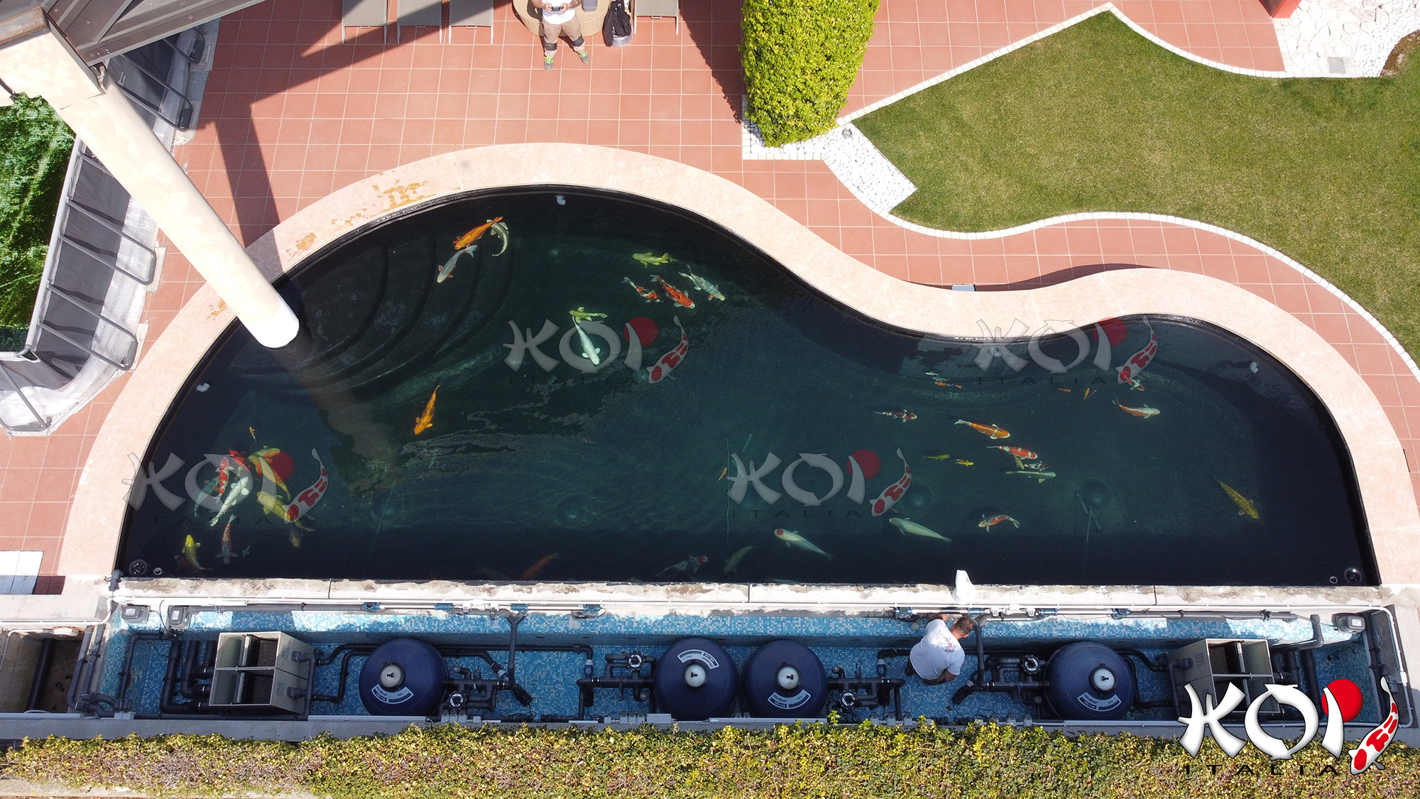 Trasformazione di una piscina in cemento armato, in un koi pond da 150.000 litri. La passione per le koi di questo koi keeper era così grande da decidere di trasformare la propria piscina in un koi pond. Una delle tante difficoltà di questo progetto è stato l'inseriemnto del sistema di filtraggio nel locale precedentemente destinato alla tapparella che copriva la piscina durante l'inverno. Impermeabilizzazione in vetroresina e sistema di filtraggio con quattro linee in parallelo composte da Sieve e Fltri a perline. A breve le foto del lavoro terminato con la copertura del locale tecnico.