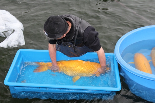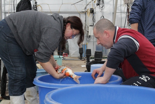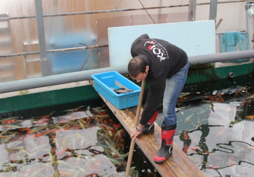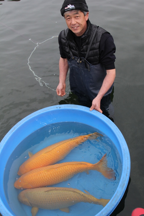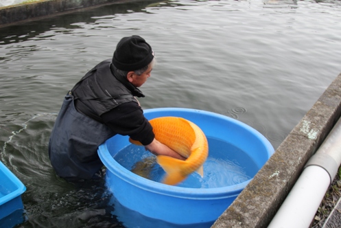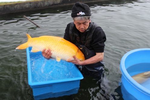 Spostiamo queste koi in un'altra vasca dove tengono unicamente le koi vendute. Quest'operazione ci consente di apprezzare meglio le dimensioni di questi esemplari!