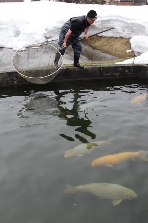 Una telefonata a Yoshiyuki Hirasawa e dopo averlo incontrato ci dirigiamo insieme a lui nell'allevamento che ha ad Urasa. Vi abbiamo già parlato di questo posto negli anni pastati. Si tratta di un allevamento con acqua termale corrente e vasche all'aperto, dove Hirasawa tiene le sue koi più grandi durante l'inverno. Dopo circa un ora di viaggio arriviamo ad Urasa, la vista toglie il fiato. Le koi che nuotano in queste vasche sono di dimensioni eccezionali e la loro mole è incredibile!