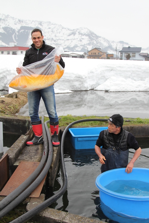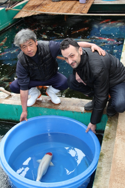 Oggi è il suo turno per il colpo di fulmine. Nella vasca delle koi “di taglia”, si innamora di una tancho di tre anni, taglia 65cm. E’ un esemplare bellissimo! Visti gli acquisti precedenti Hirasawa ci propone un prezzo in rapporto alla qualità dell’esemplare irresistibile. E Nicola non resiste.