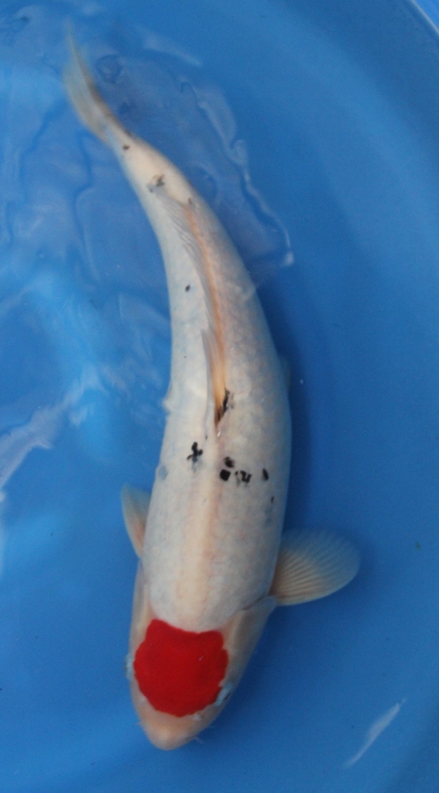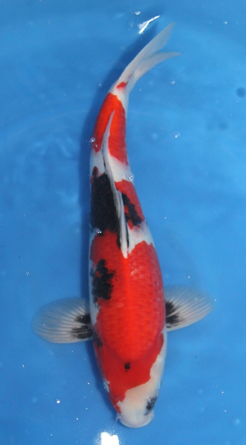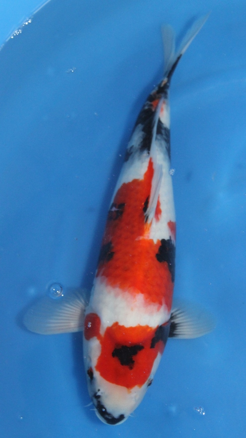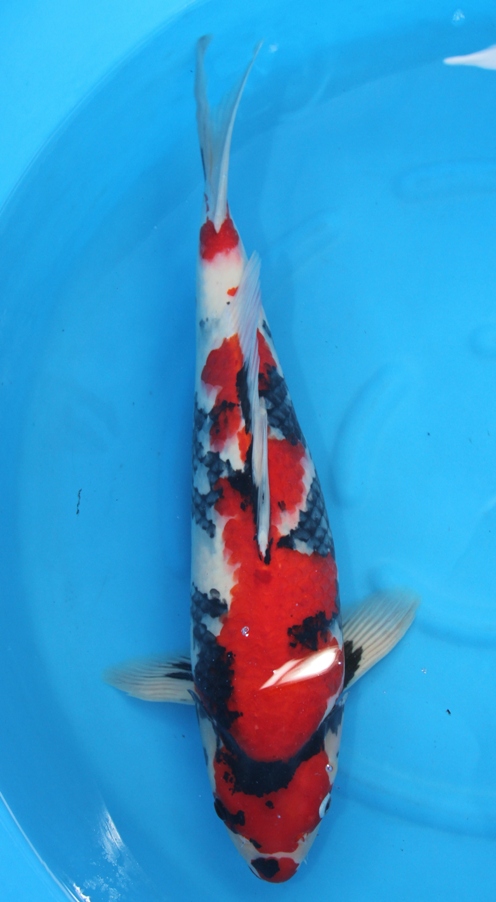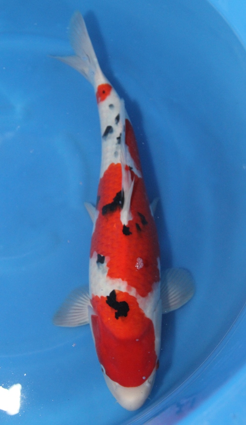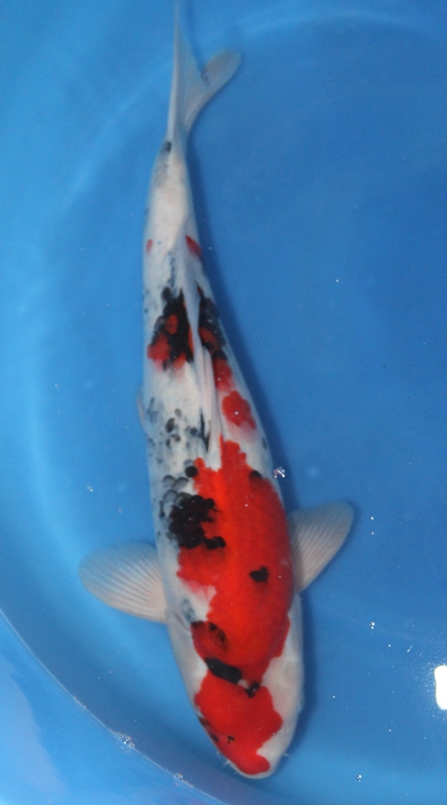 Infine seleziono una tancho sanke con un elevato potenziale di sviluppo. Questa koi è già bilanciata e ha molte zone dove il nero dovrebbe uscire a breve. La potenzialità è veramente molto alta e il KH più alto che troverà in Italia accelererà il suo sviluppo.