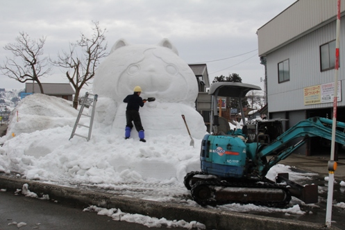 Con questo allevatore abbiamo fatto il pieno. Abbiamo l’ultimo appuntamento con Marudo dopo pranzo per selezionare alcune jumbo tosai tateshita e poi prenderemo il treno per tornare a tokyo. Sulla strada del ristorante troviamo una scultura di neve work in progress. Solo in Giappone!