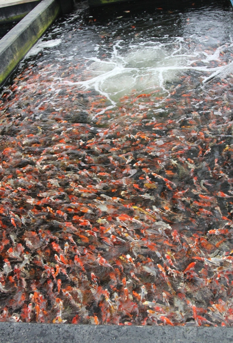 Qui selezioniamo un bel pò di nissai taglia 35-40cm. Le vasche sono stracolme di koi e contrariamentea quello che sembra selezionare dei buoni esemplari è molto, molto complicato. Quando si posano gli occhi su un esemplari, questo sparisce inghiottito dal branco!