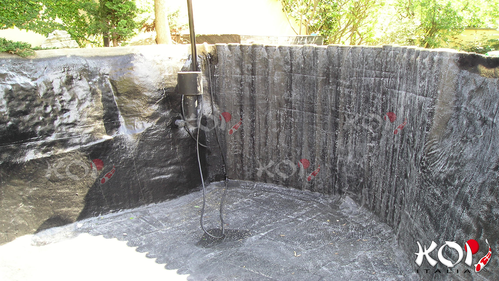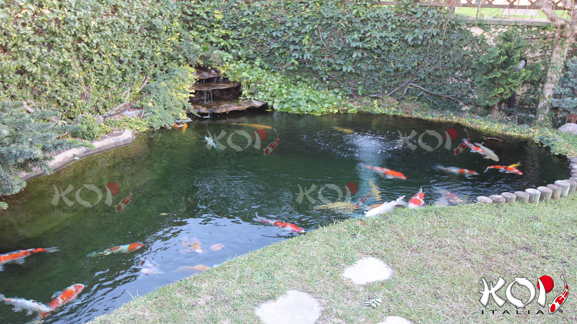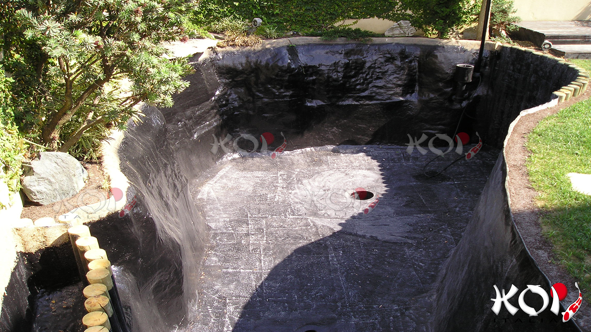 Koi pond realizzato in Toscana con impermeabilizzazione in vetroresina, doppia linea di filtraggio a camere e perline.