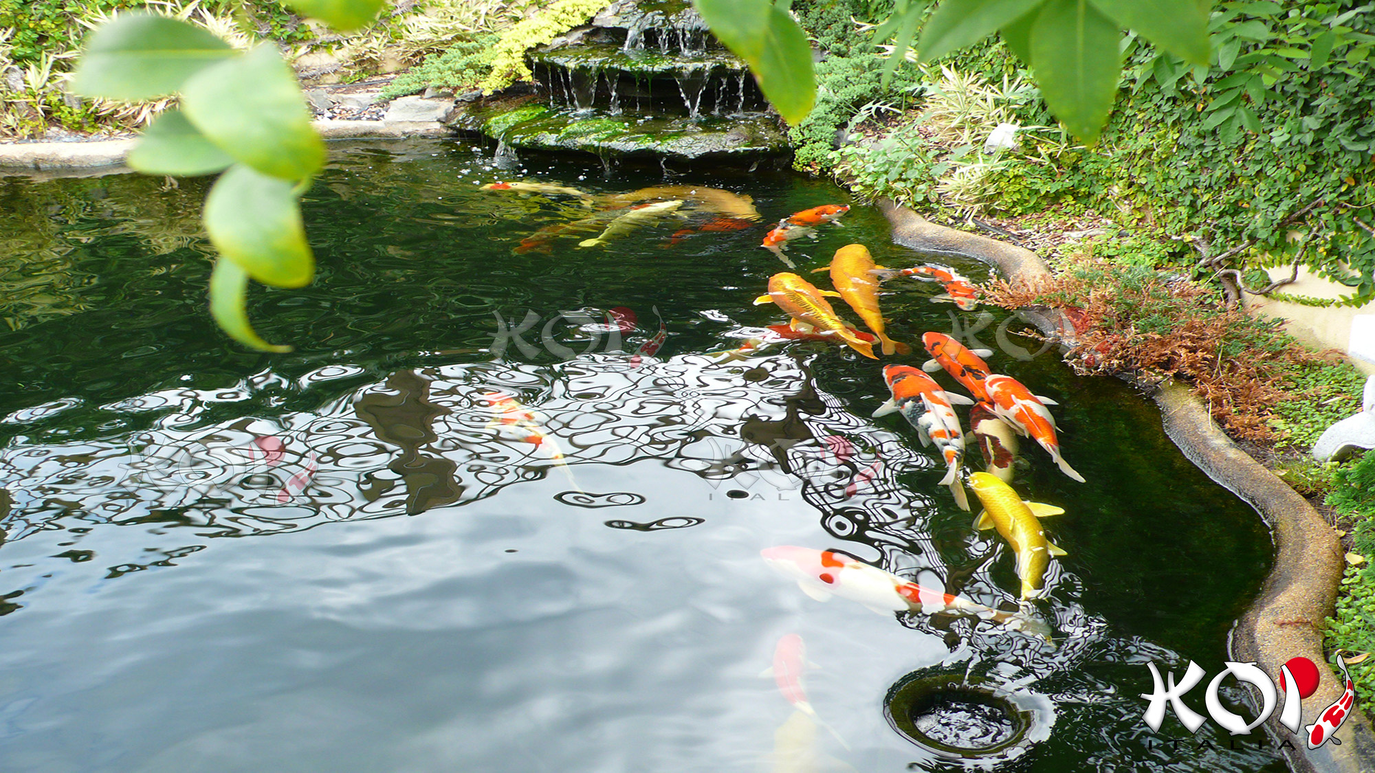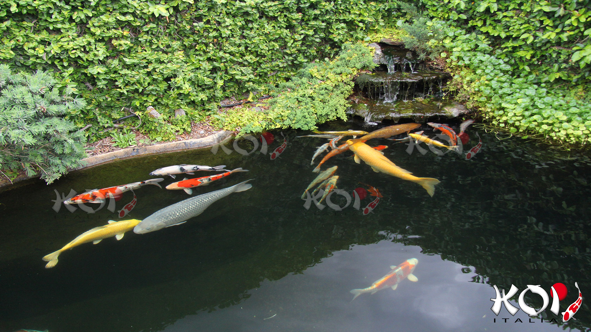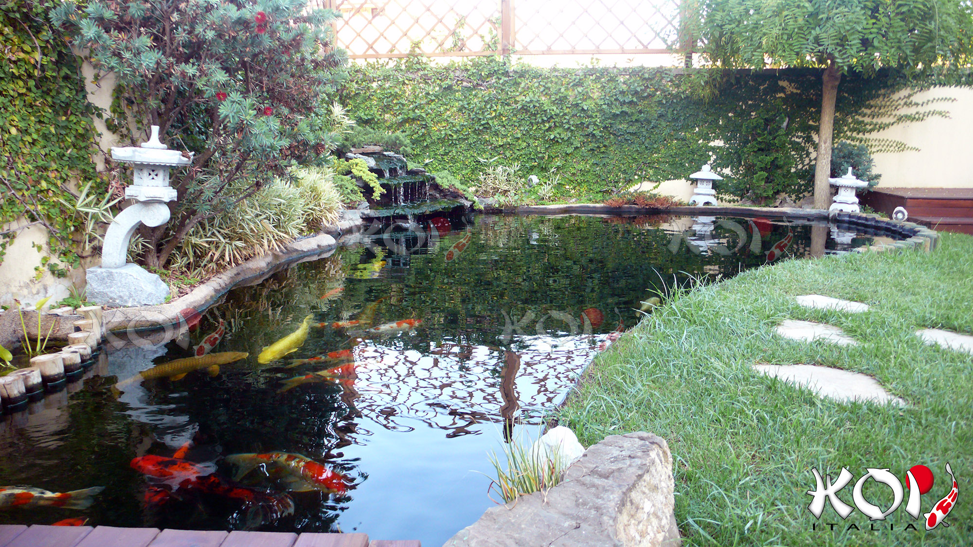 Koi pond realizzato in Toscana con impermeabilizzazione in vetroresina, doppia linea di filtraggio a camere e perline.