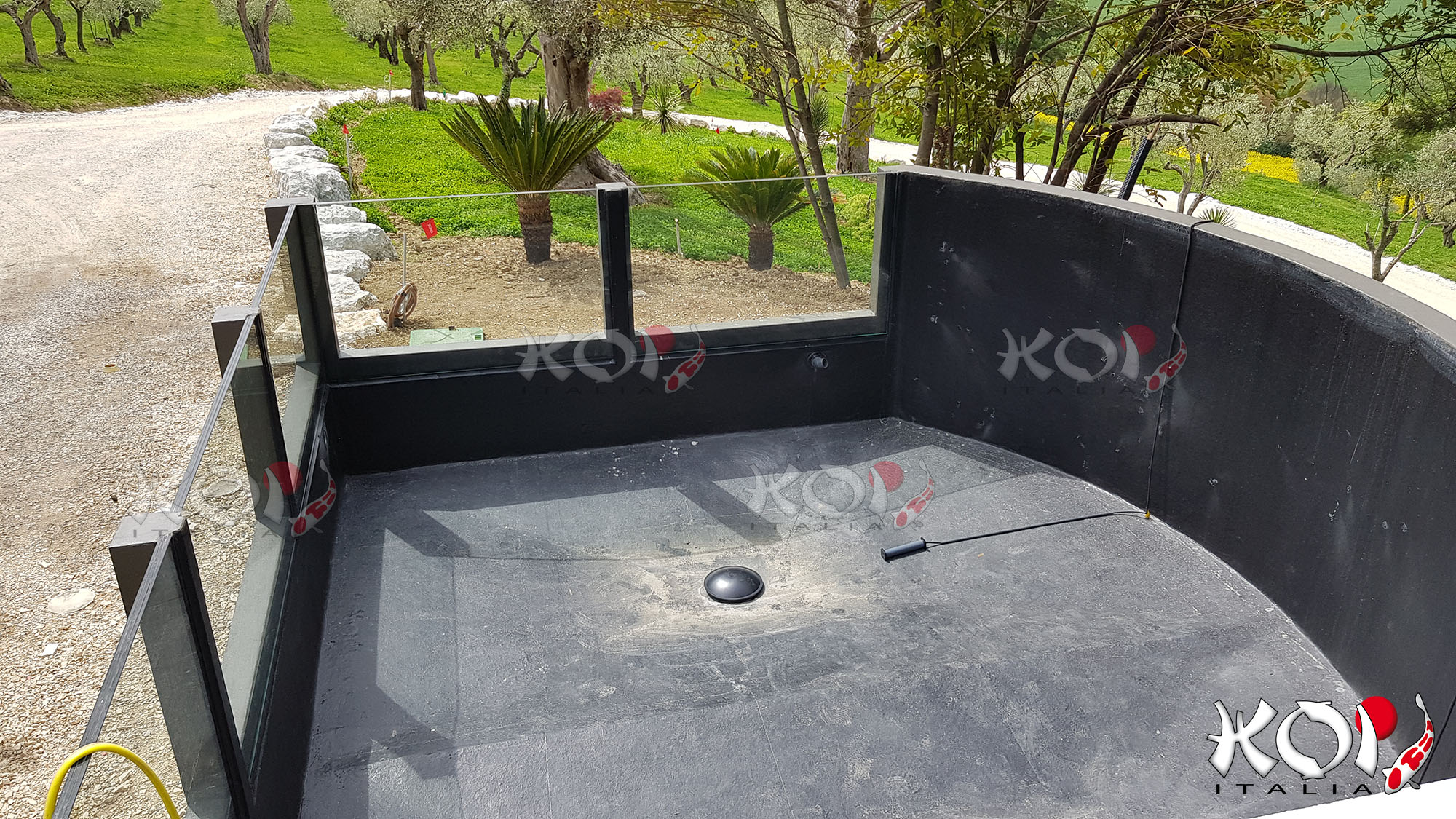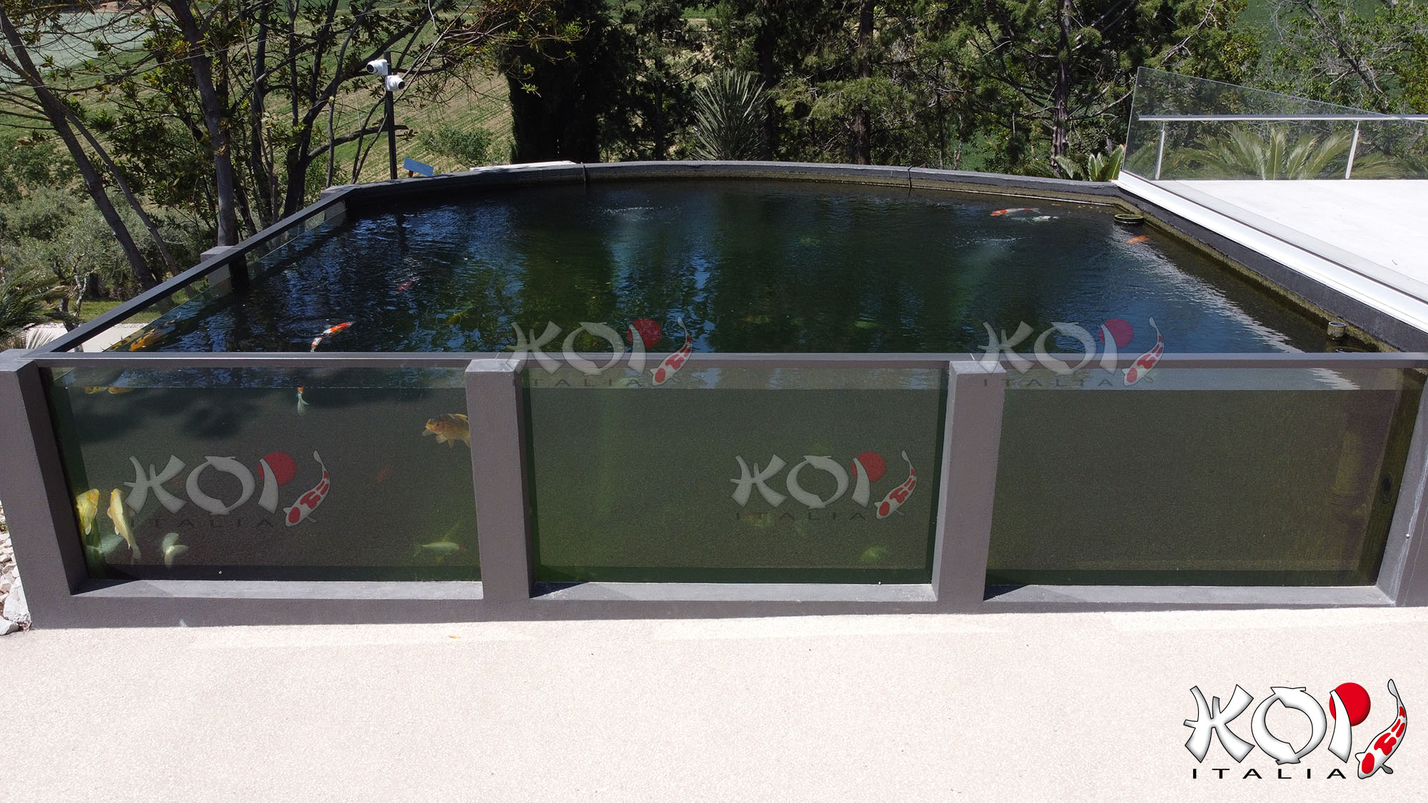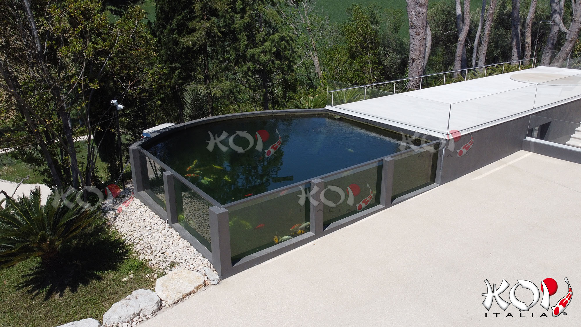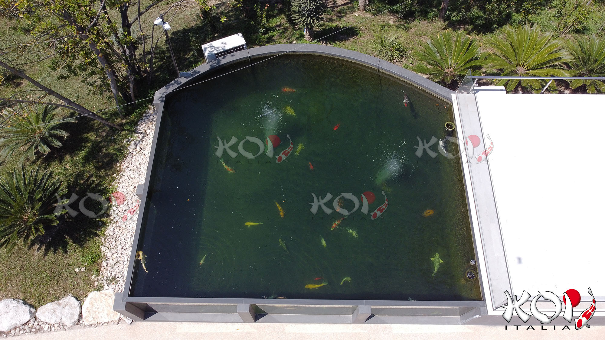 Koi pond realizzato in cemento armato e impermeabilizzato in vetroresina. Questo scenico koi pond ha una profondità di 2.20 mt. Per metà è interrato e per l'altra metà e fuori terra. Filtraggio realizzato con filtri a perline.