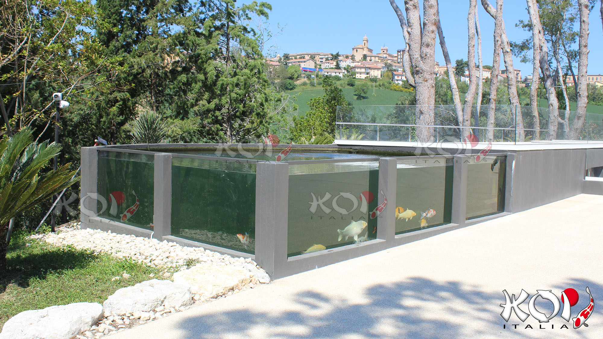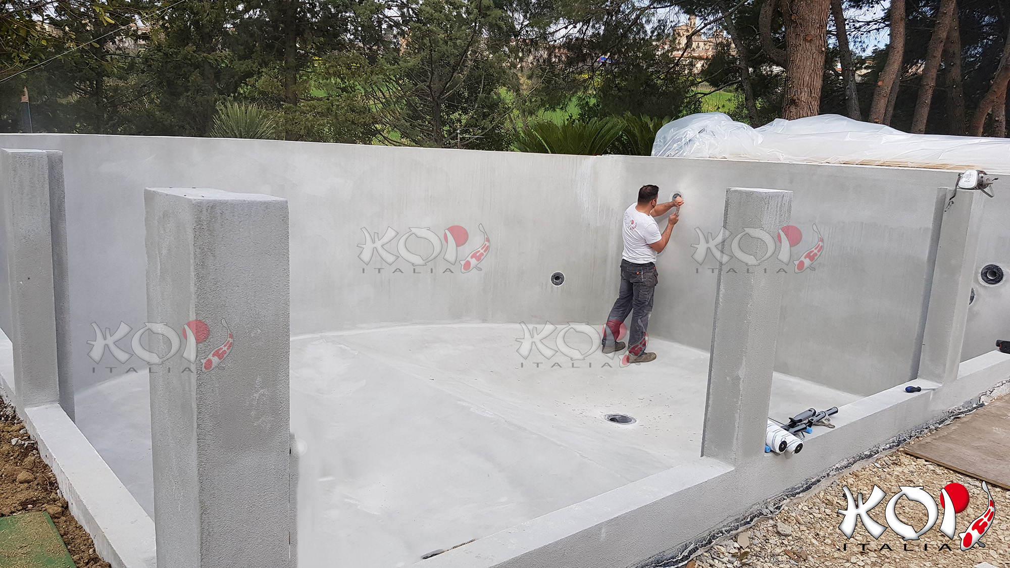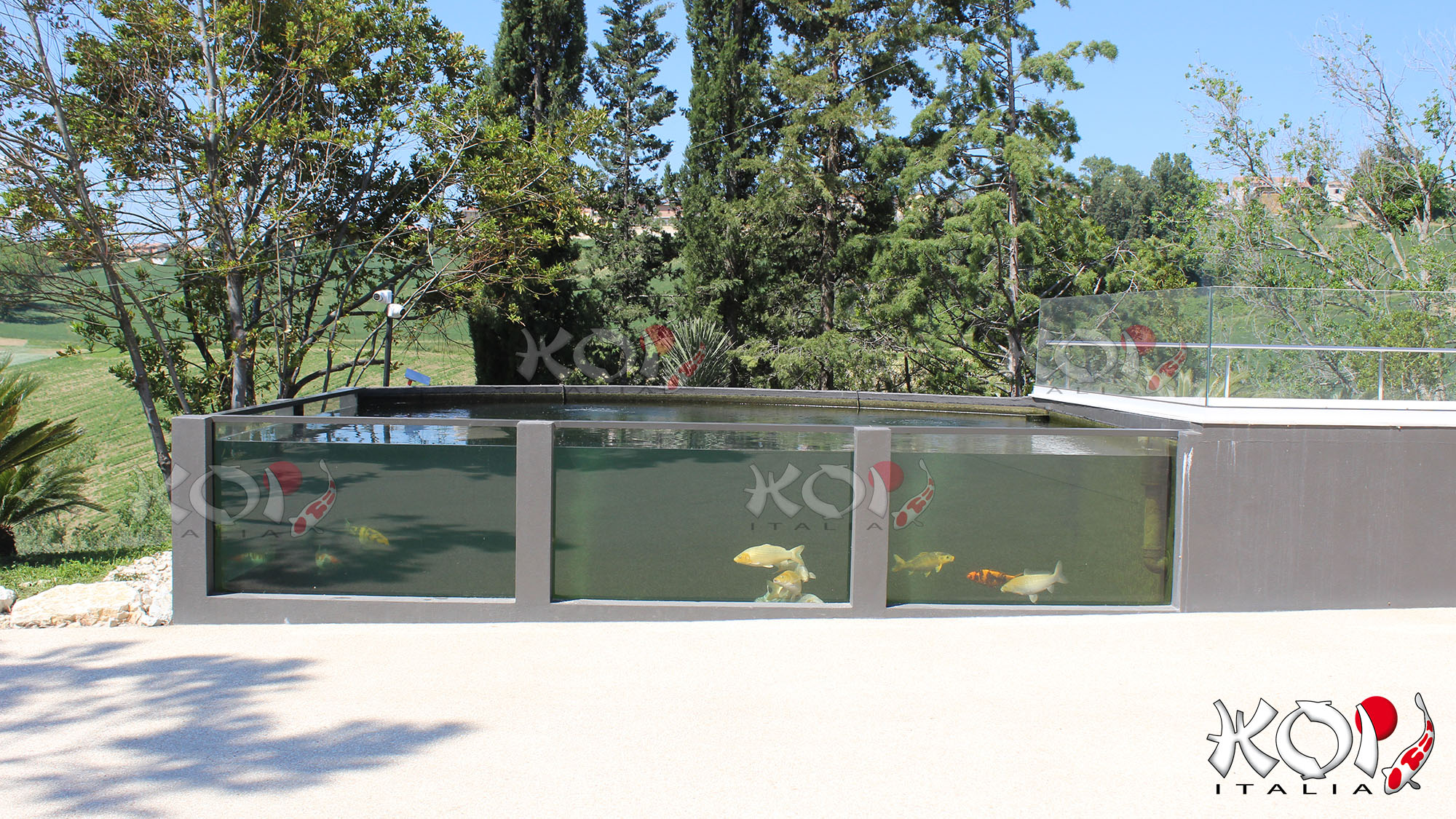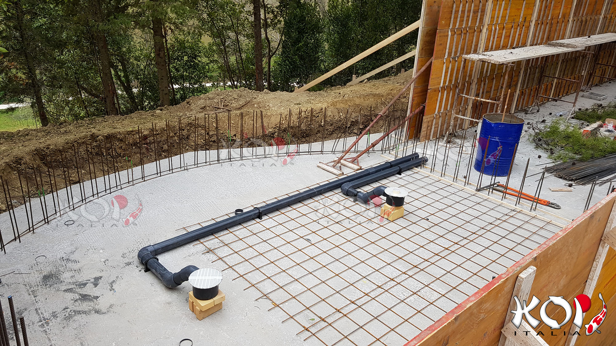 Koi pond realizzato in cemento armato e impermeabilizzato in vetroresina. Questo scenico koi pond ha una profondità di 2.20 mt. Per metà è interrato e per l'altra metà e fuori terra. Filtraggio realizzato con filtri a perline.