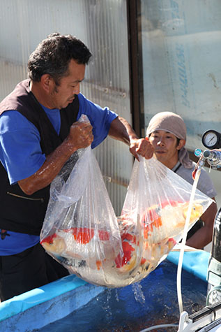 Questo allevatore produce unicamente go-sanke di altissima qualità. Solo il 7-8% delle uova deposte dai riproduttori viene portato a maturazione. Il lavoro di selezione qui è altissimo ma è ripagato dalla qualità. La scorsa settimana qui si è tenuta un asta e alcune nisai sono state battute a più di 15000 euro…