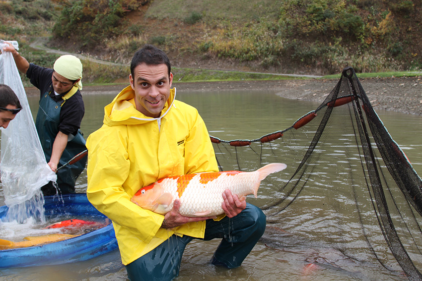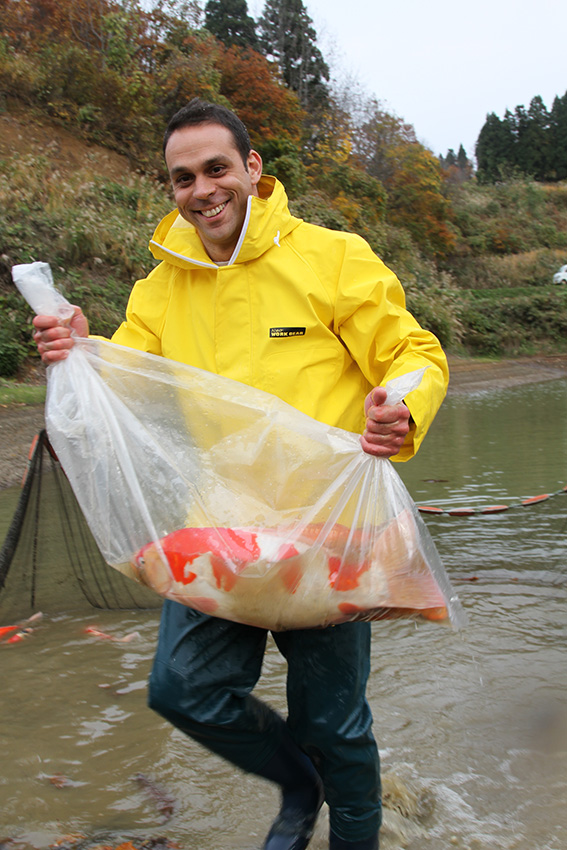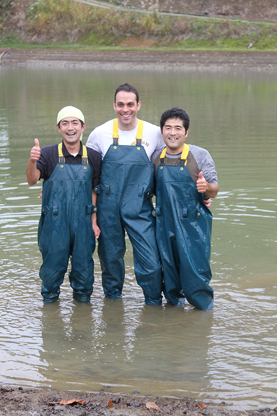 Quando siamo ancora in albergo di fronte al caffè, il nostro agente giapponese riceve una telefonata. E' Daisuke Hishiara dell'allevamento di Yagenji. Rob, il nostro agente sorride durante la telefonata. Con il sorriso ancora stampato sula bocca chiude la telefonata e mi dice "ricorderai questo giorno per tutta la tua vita". Daisuke ci ha appena proposto di aiutarlo per svuotare il mud pond dove tiene i suoi riproduttori. La mia gioia è incontenibile. Vedrò uscire dal fango esemplari stupendi e lo farò con le mie mani! Quando ho iniziato a venire in Giappone questo era solo un sogno.