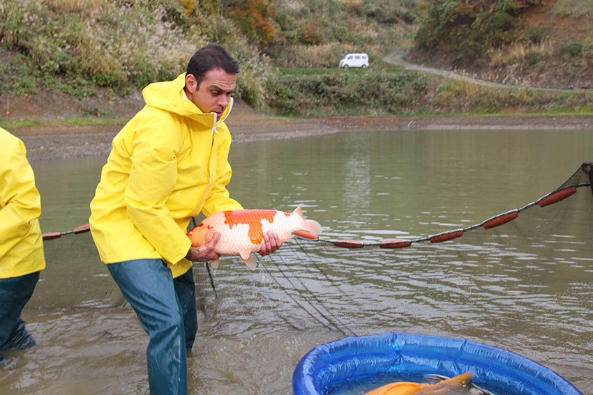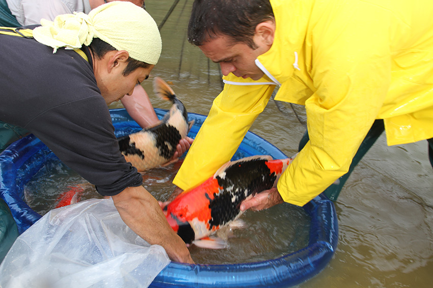 Il primo allevatore della giornata è Hasegawa. Questo allevatore è rinomato per go-sanke ma in particolare per le kohaku. Le sue koi hanno una linea genetica molto buona per quanto riguarda il body line. Le sue koi sono spesso molto possenti e muscolose. Qui selezioniamo alcune koi di due anni molto, molto promettenti.