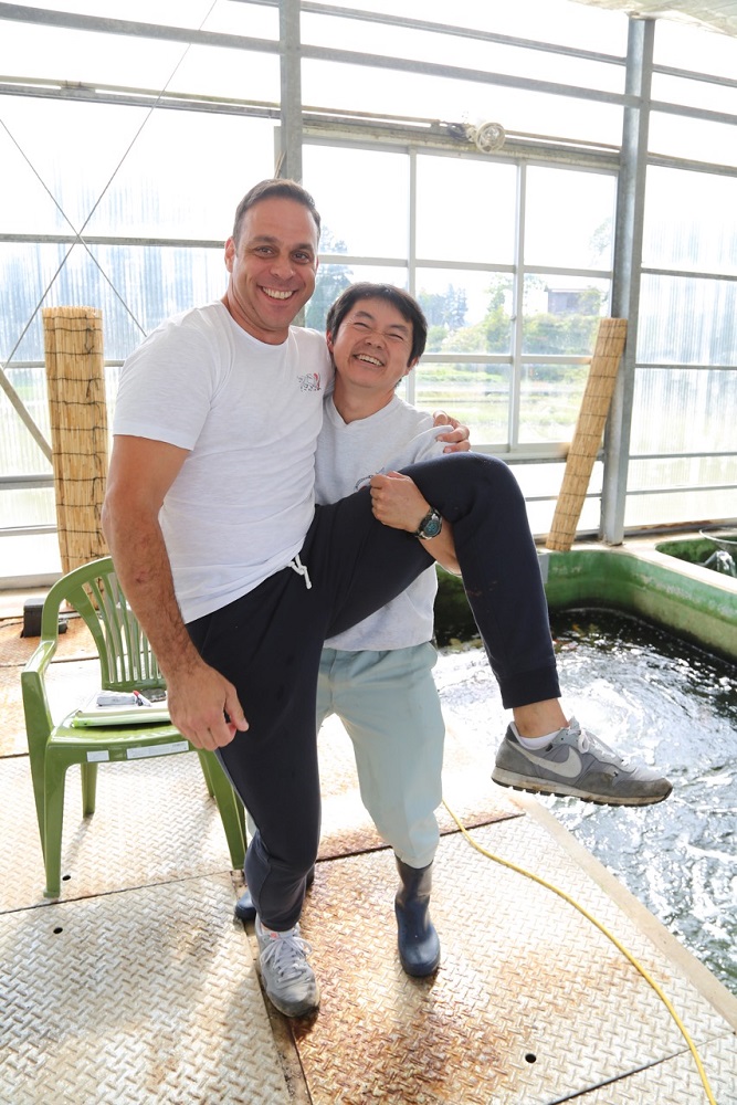 Manabu vorrebbe prendermi in collo per fare una foto prima di salutarci... diciamo che se vogliamo continuare a selezionare le sue koi in futuro è meglio tenere un piede a terra!