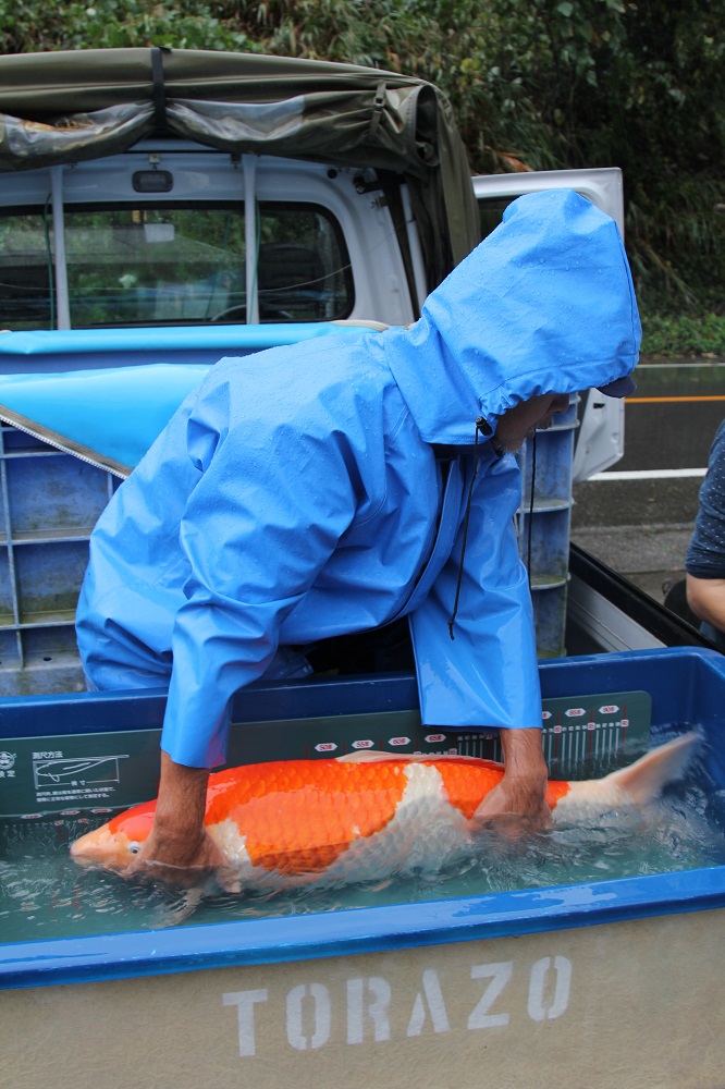 La tentazione di portare a casa qualcuna di queste koi è molto alta e alla fine cediamo! Selezioniamo alcuni esemplari di jumbo showa di due anni. Il body di queste koi è pazzesco. Tutte hanno il nero in progressione (come dovrebbe sempre essere su koi di questa età). Questo è il genere di koi da veder crescere e migliorare nel proprio laghetto anno dopo anno. Siamo al settimo cielo per questa selezione. Il prezzo a cui siamo riusciti ad acquistare questi esemplari è incredibilmente basso, forse Masayuki si ricorda ancora quando nel 2011 abbiamo abbiamo trattato uno sconto a braccio di ferro! Scherzi a parte, la qualità di queste koi è veramente alta. Siamo strafelici di portarle a casa!