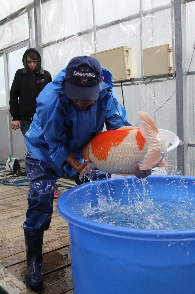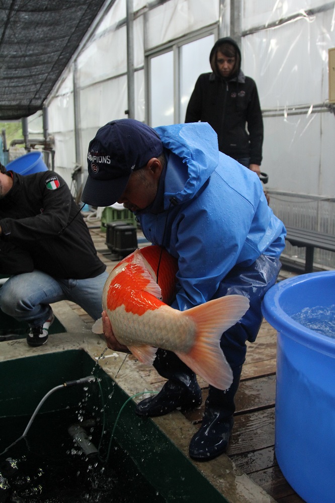 Ci fermiamo da Torazo proprio quando sta portando nella serra alcune delle sue jumbo provenienti dal mud pond. Il body delle sue koi è impressionante.