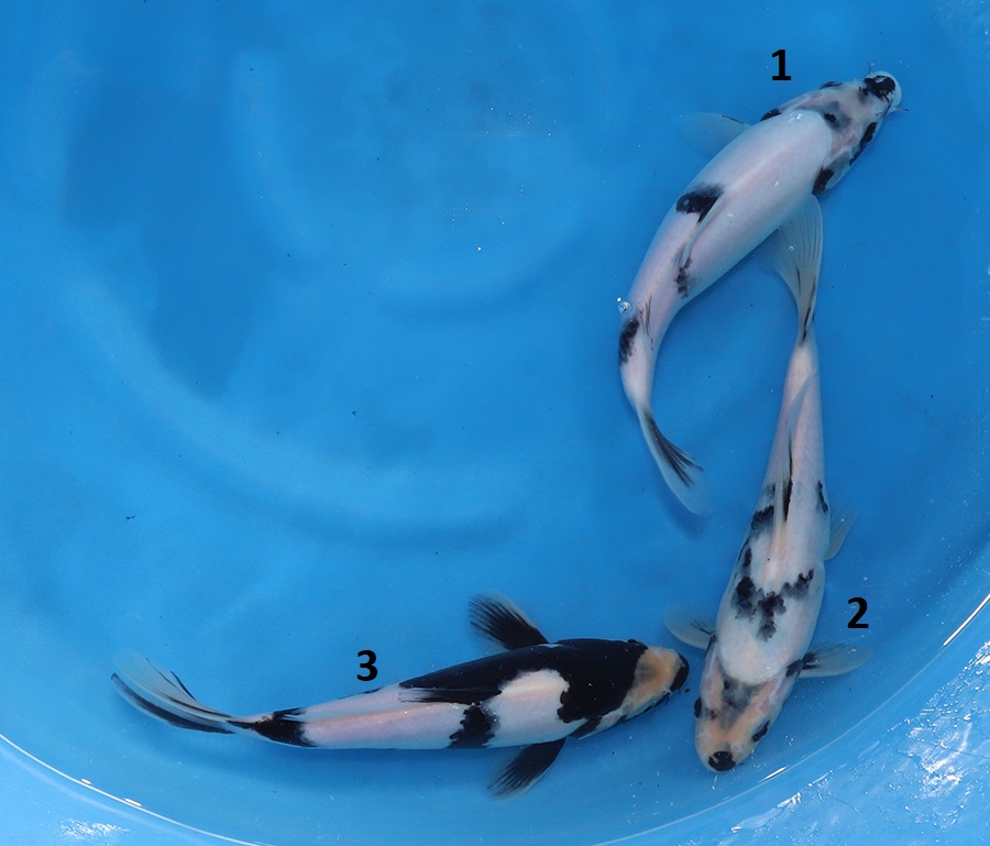 Anche in questo allevamento siamo a caccia di tosai. Dalla prima vasca dove ci sono circa 700 tosai taglia 20-25cm ne selezioniamo 3: una con il nero quasi finito e due che secondo noi avranno un ottimo sviluppo in futuro. La purezza e la brillantezza del bianco su queste 3 koi è veramente all'altezza della reputazione che questo allevatore si è costruito negli anni.
