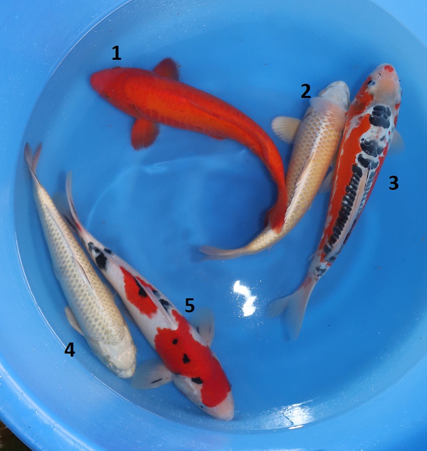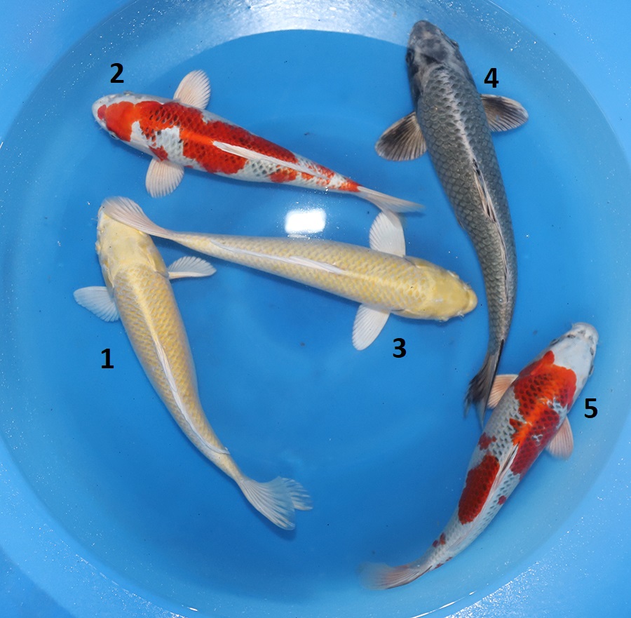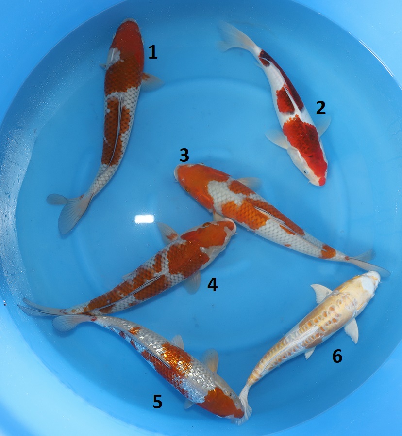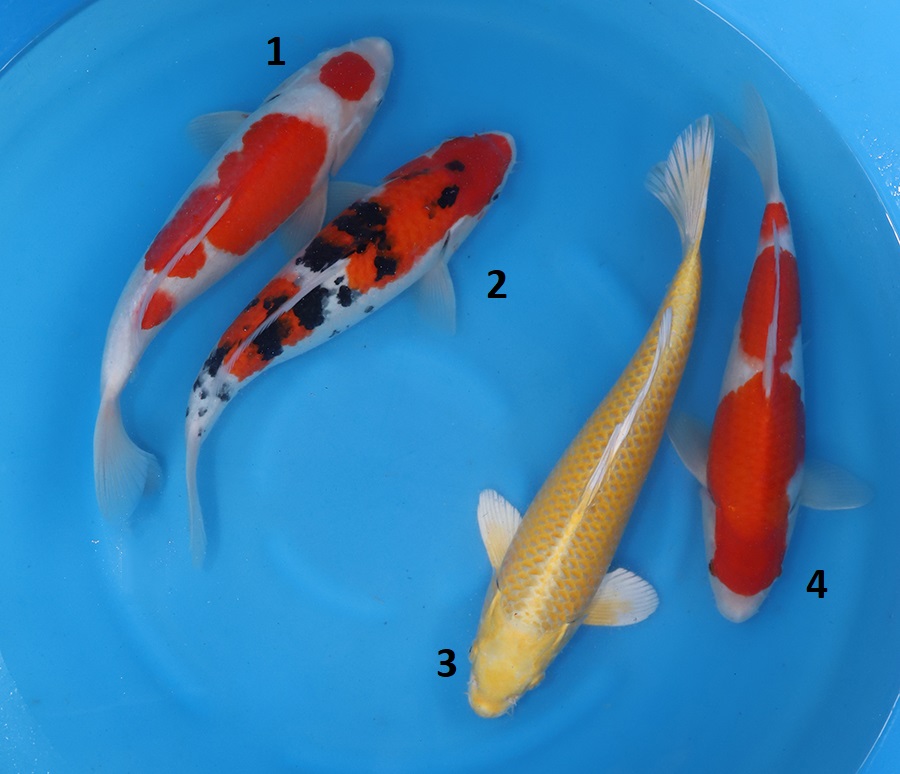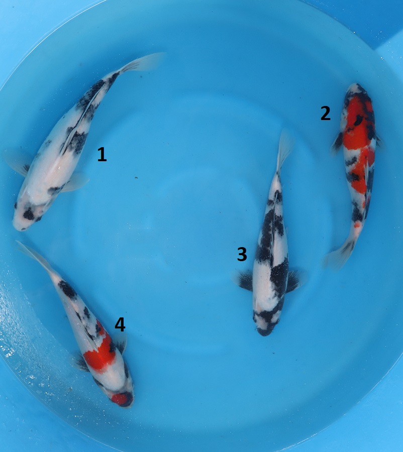 La taglia di queste koi è da non credere. Hanno solo 9 mesi! Body, qualità della pelle, pattern e potenziale di sviluppo, c'è tutto quello che si può sperare di trovare su una jumbo tosai. La più piccola che selezioniamo misura 38 cm! Ecco, dopo circa un ora, quelle che secondo noi sono le migliori quattro della vasca. Vi consigliamo di guardare i video selezionando la qualità HD.