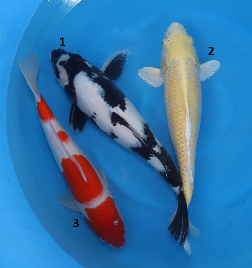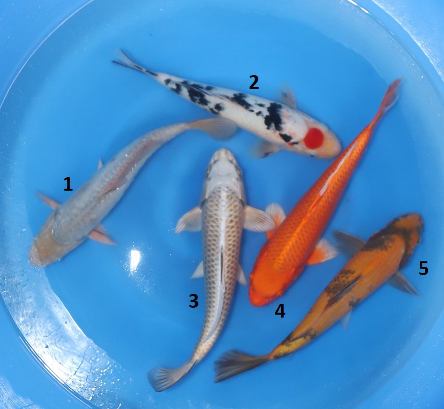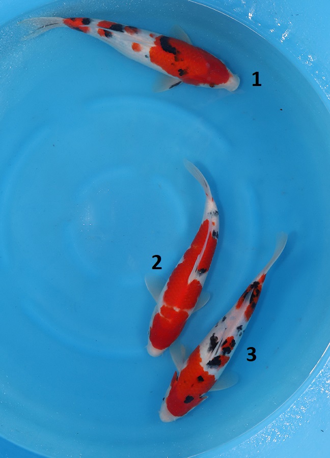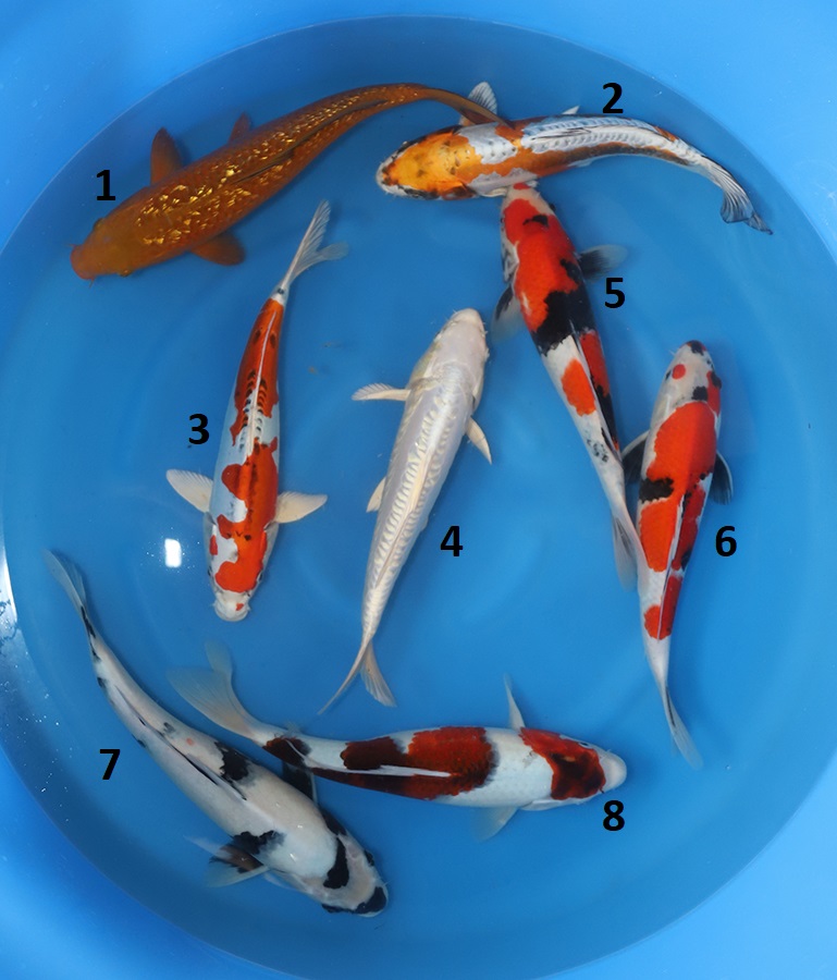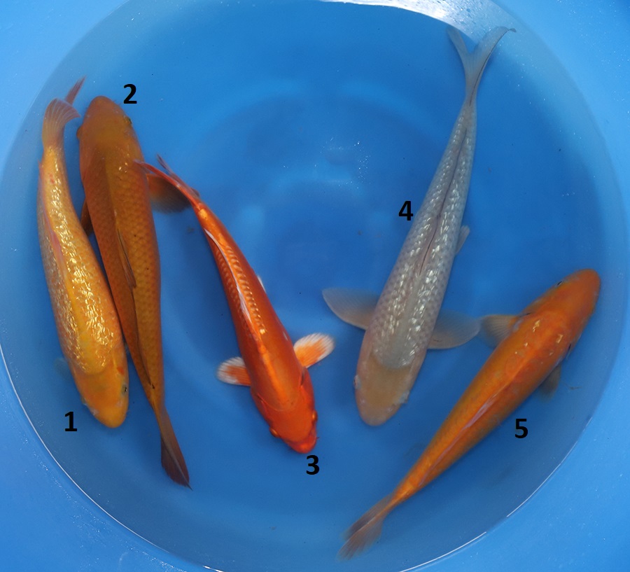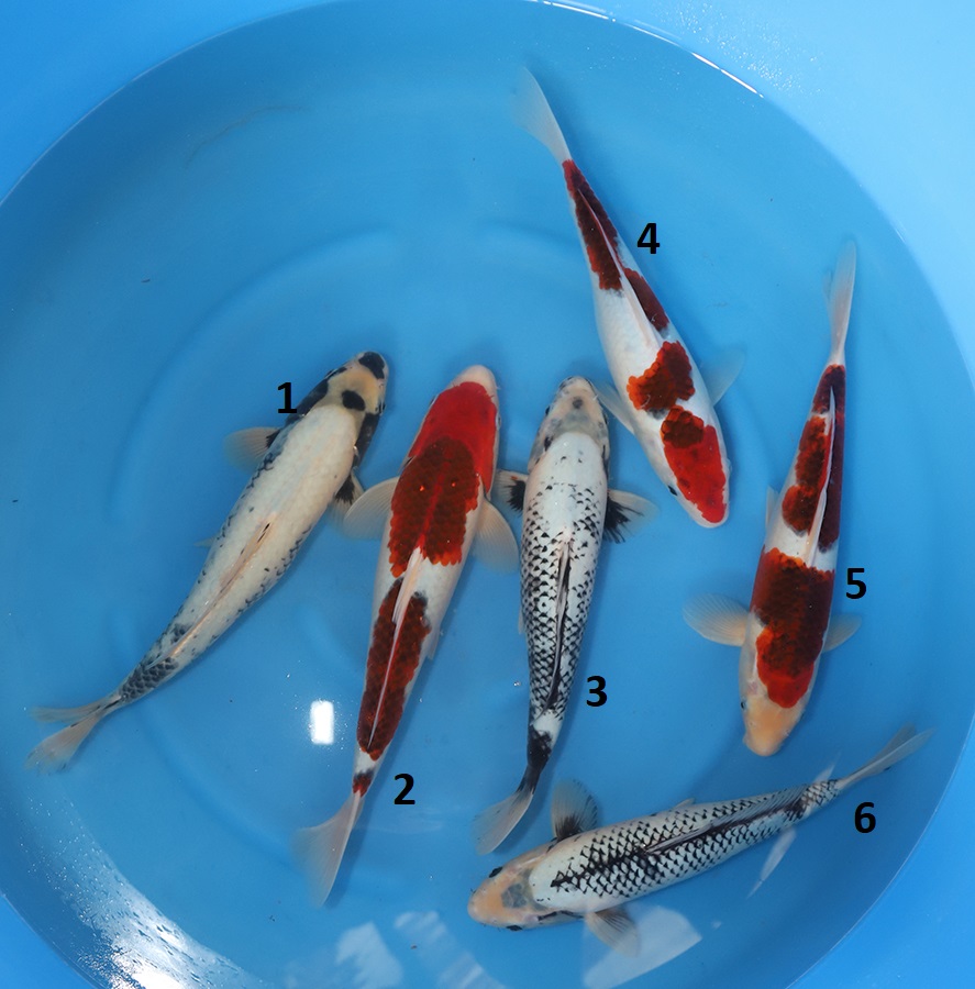 La taglia di queste koi è da non credere. Hanno solo 9 mesi! Body, qualità della pelle, pattern e potenziale di sviluppo, c'è tutto quello che si può sperare di trovare su una jumbo tosai. La più piccola che selezioniamo misura 38 cm! Ecco, dopo circa un ora, quelle che secondo noi sono le migliori quattro della vasca. Vi consigliamo di guardare i video selezionando la qualità HD.