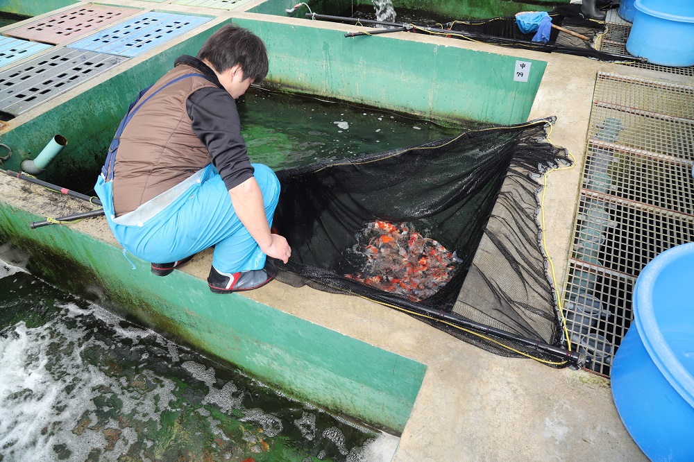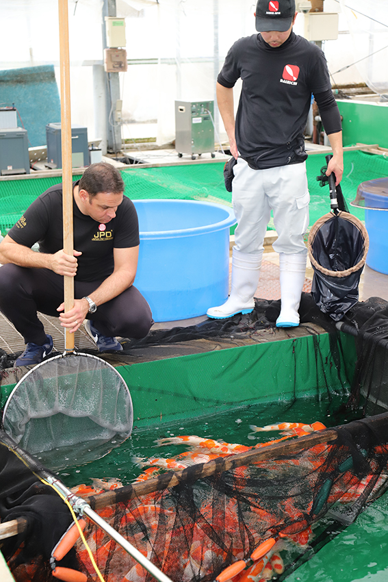 Lasciato questo allevatore ci rechiamo da Isa. Qui troviamo delle showa jumbo tosai interessanti e chiediamo di passare la rete sulla vasca per selezionarle.