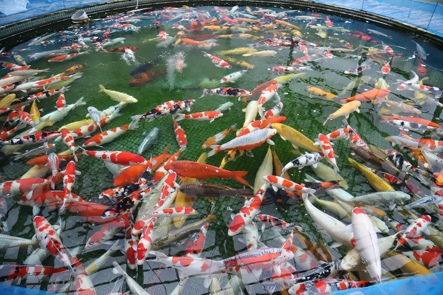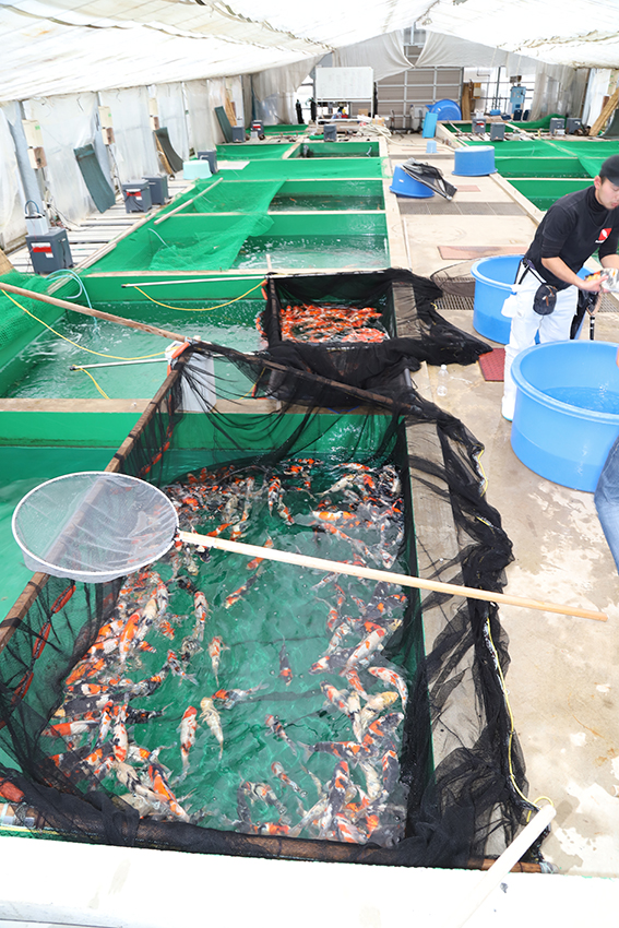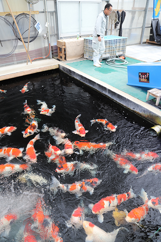 Come molti sanno questo allevatore ha da poco vinto l'All Japan Koi Show. La kohaku vincitrice del più prestigioso concorso per koi del mondo è nell'allevamento e vederla nuotare in vasca con altre koi della stessa taglia è impressionante.