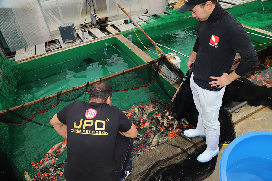 Alla fine decidiamo di tornare da Maruhiro. Nelle sue vasche ha una quantità tale di koi, per cui si devono passare ore a cercare.
