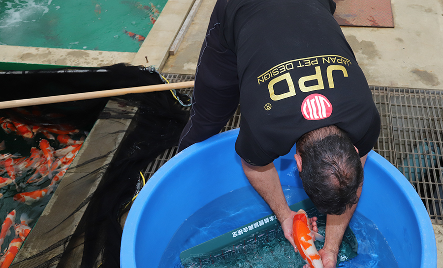 Ci spostiamo in un altre vasche dove ci sono go-sanke e shiro di qualità sempre maggiore e qui selezioniamo altri esemplari.