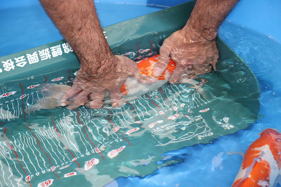 Ci ritroviamo a pescare in una delle vasche “senza prezzo”. Qui è l’allevatore che decide il prezzo di ogni singolo esemplare. Decidiamo di selezionare esemplari più rari e difficili da trovare. In particolare alcuni di questi, con questo livello qualitativo, si possono trovare solo qui!