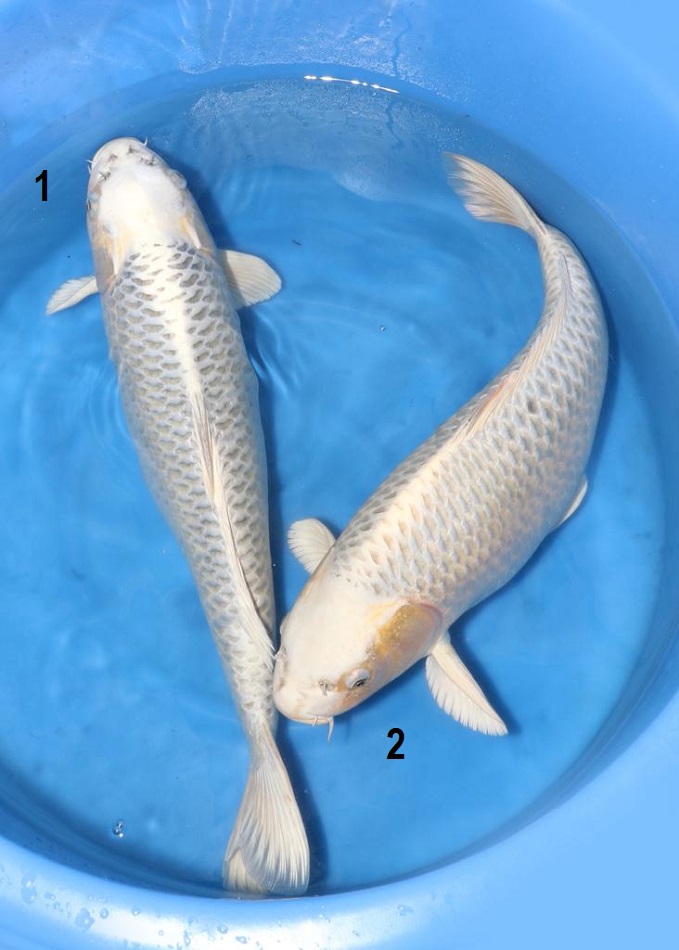 Iniziamo con due bellissimi esemplari di Mukashi ogon di 3 anni, dell'allevatore Ryoji. La caratteristica di questa varietà è il tasso di accrescimento molto, molto spinto. Siamo riusciti ad aggiudicarcele ad un prezzo ottimo, perciò sono l'ideale per chi desidera contenere la spesa e crescersi una jumbo!