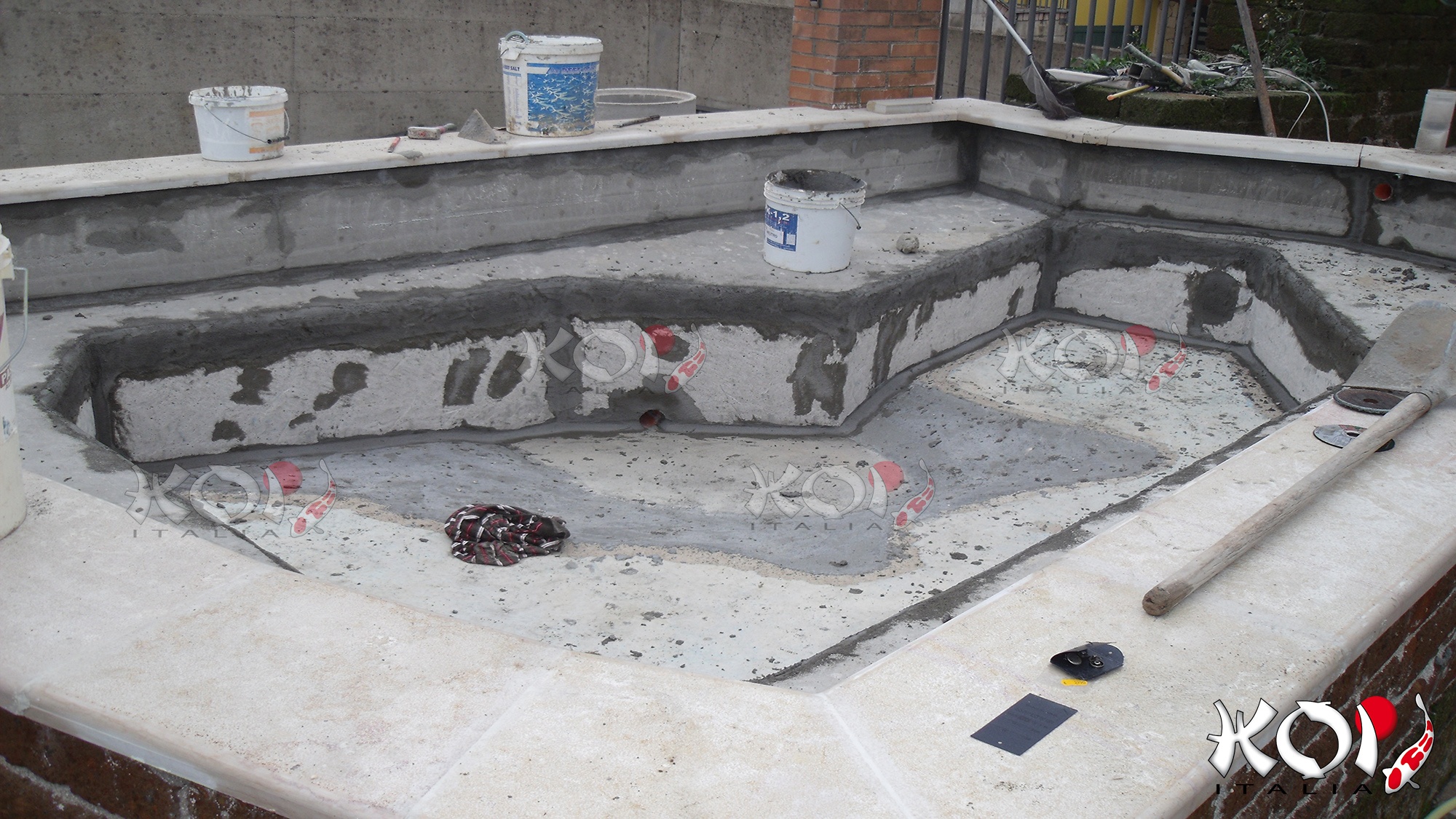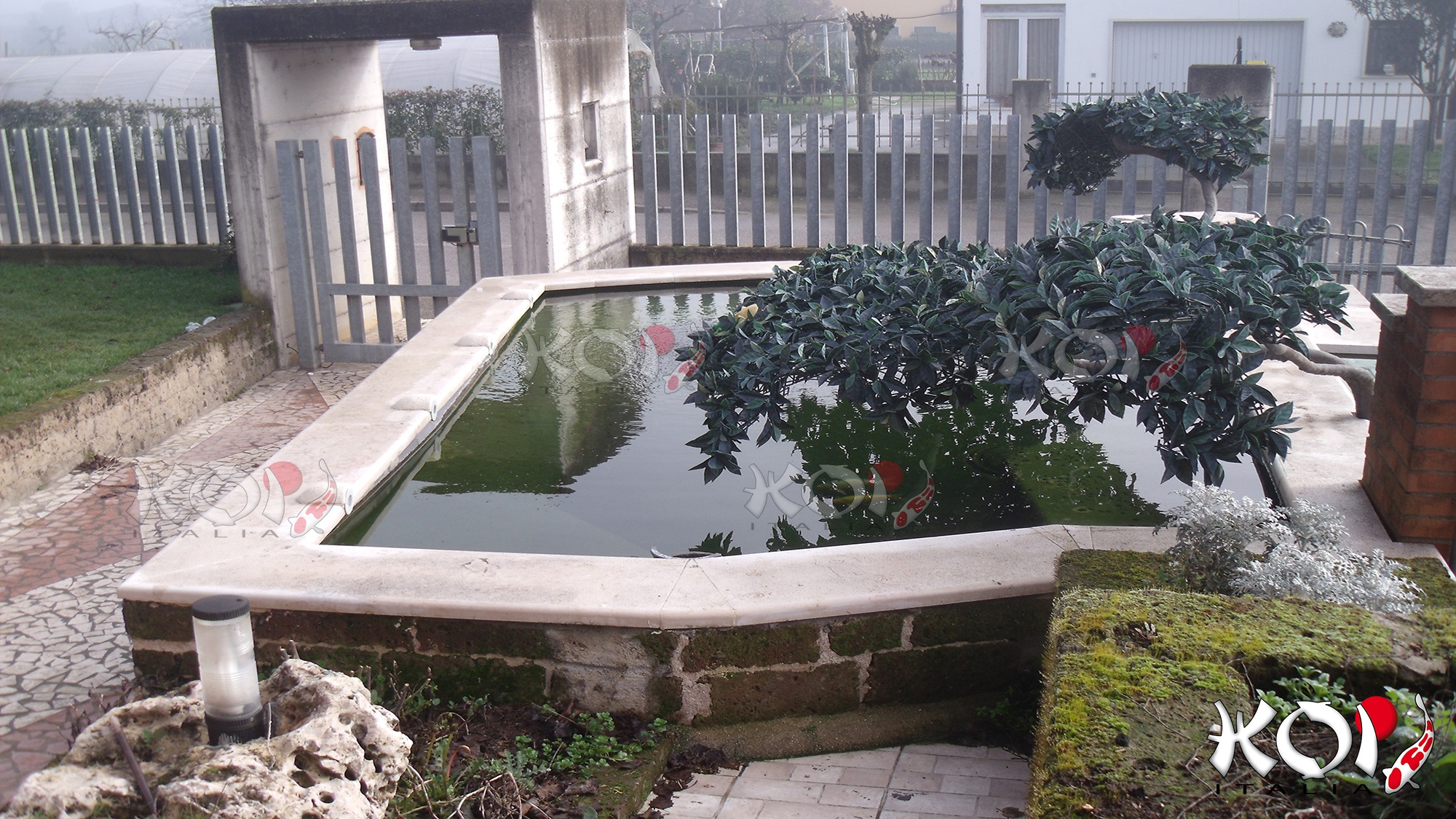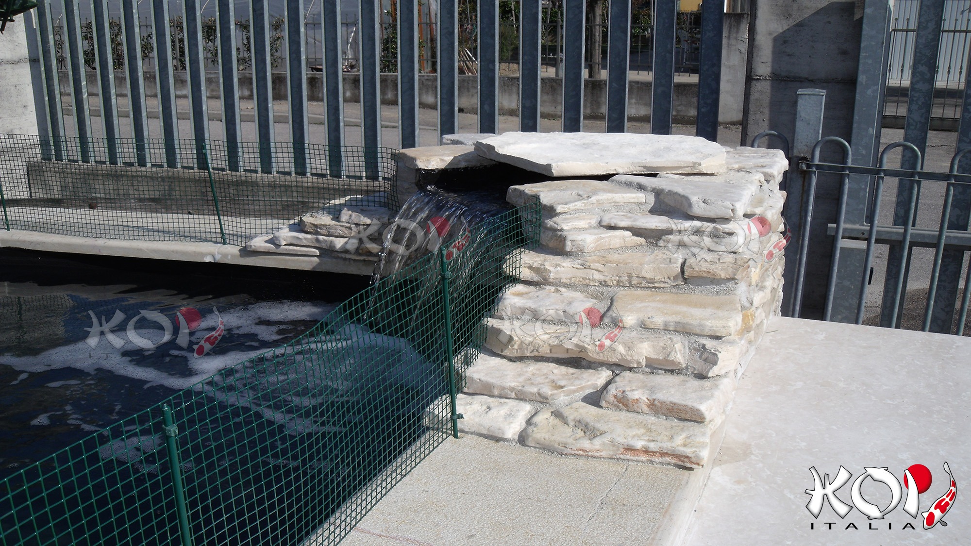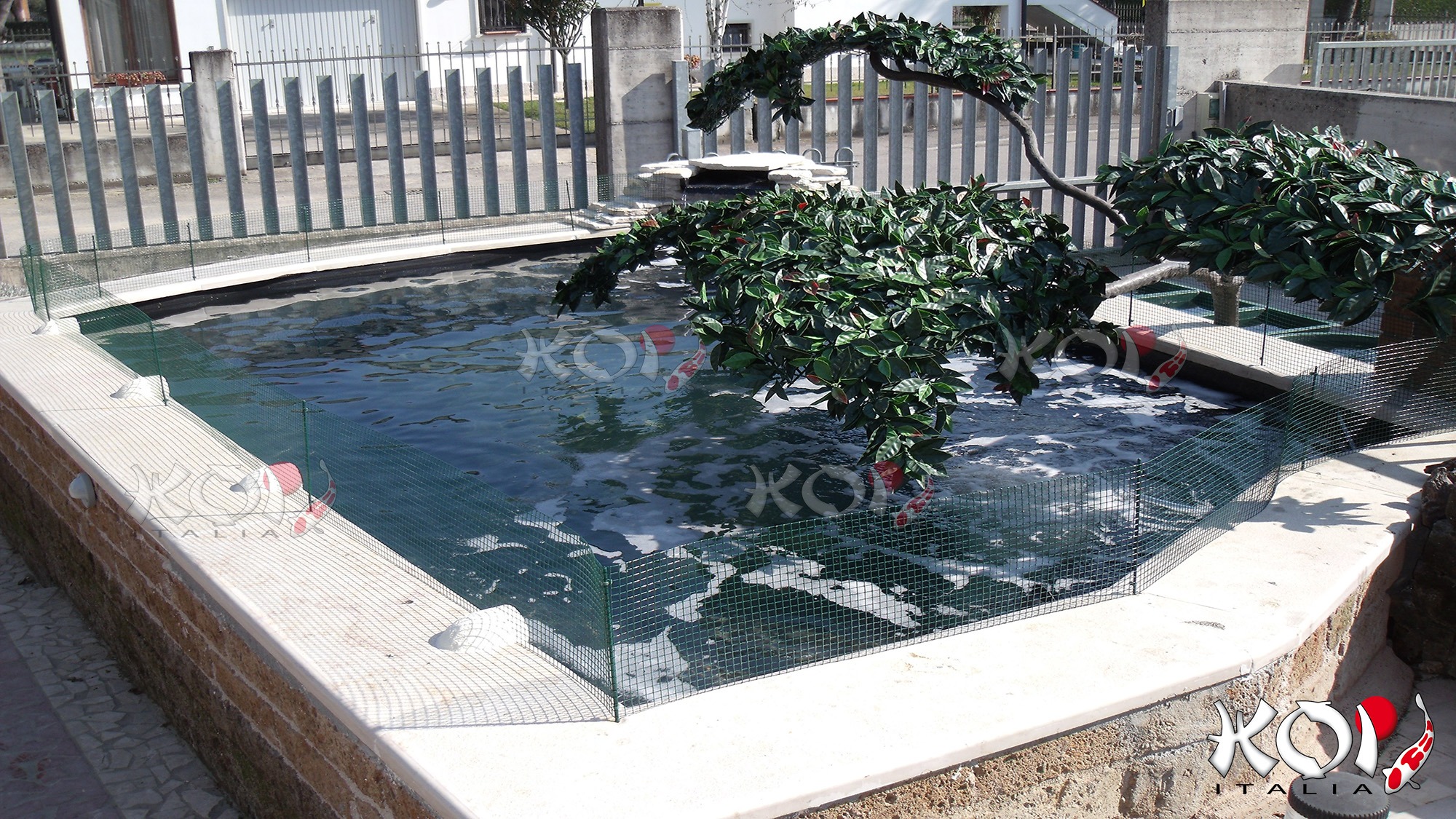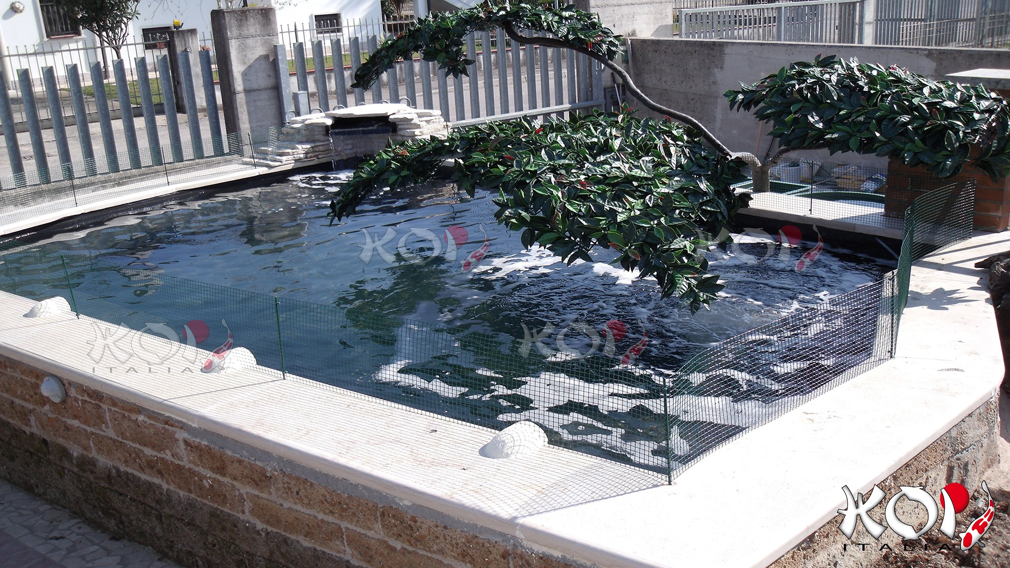 Koi pond realizzato in cemento e impermeabilizzato con telo in Epdm. Il sistema di filtraggio è costituito da un prefiltro Sieve, un filtro a perline e un filtro a letto fluido.