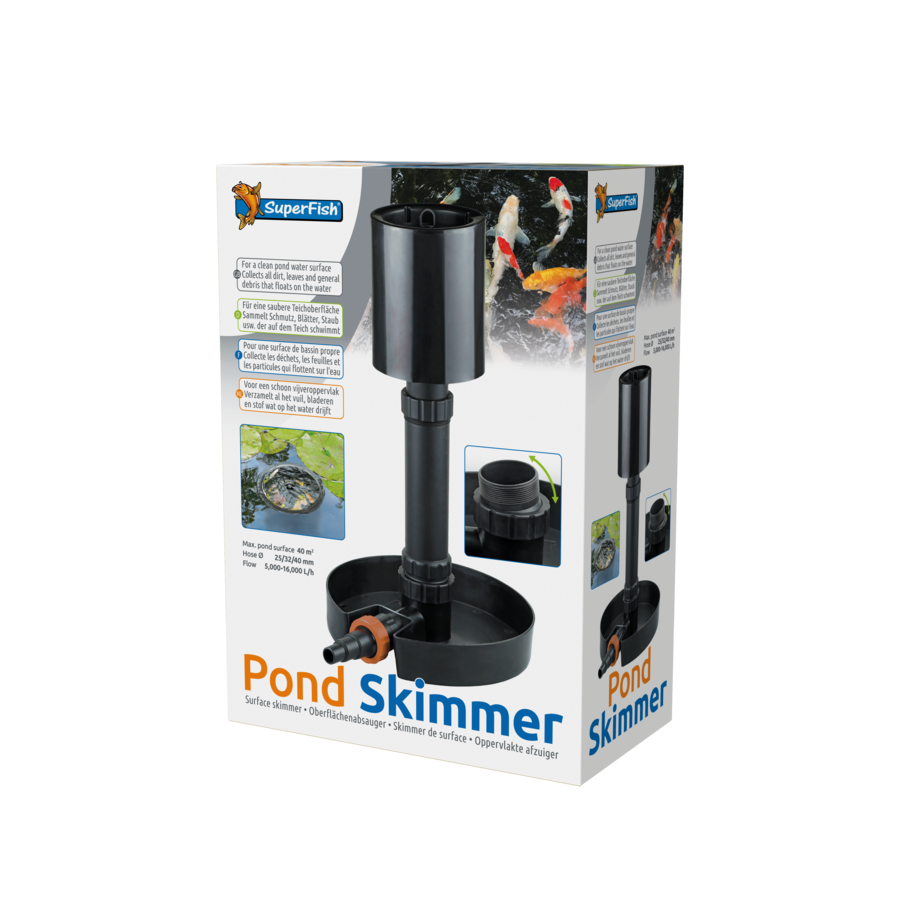 L'utilizzo dello skimmer è di fondamentale importanza per la pulizia del vostro pond e per ridurre la manutanzione del filtro. Applicando questo aspiratore la superficie dell'acqua risulterà sempre libera e pulita ed il vostro filtro avrà meno depositi. Tutti i detriti aspirati si accumulano in un cestello, facilmente e rapidamente rimovibile per la pulizia.